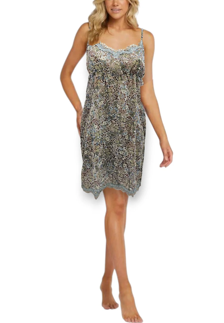 Sottoveste Verde Veronica fullprint floreale chiffon di viscosa con rifiniture in pizzo. 45% viscosa 36% poliestere 16 %poliammide 3% elastan