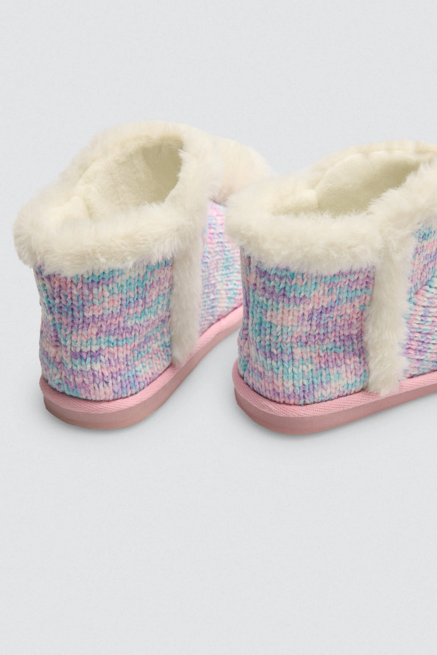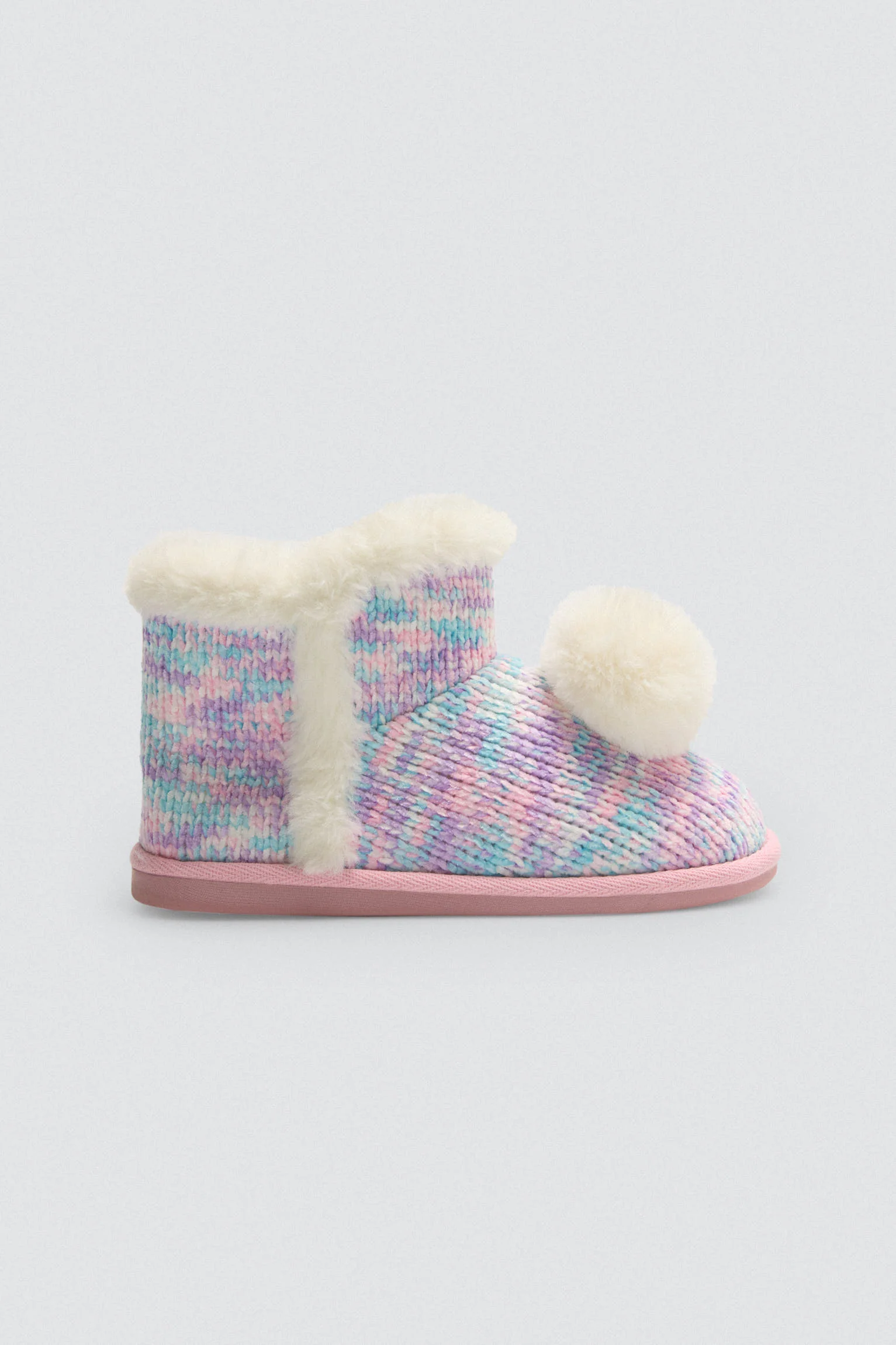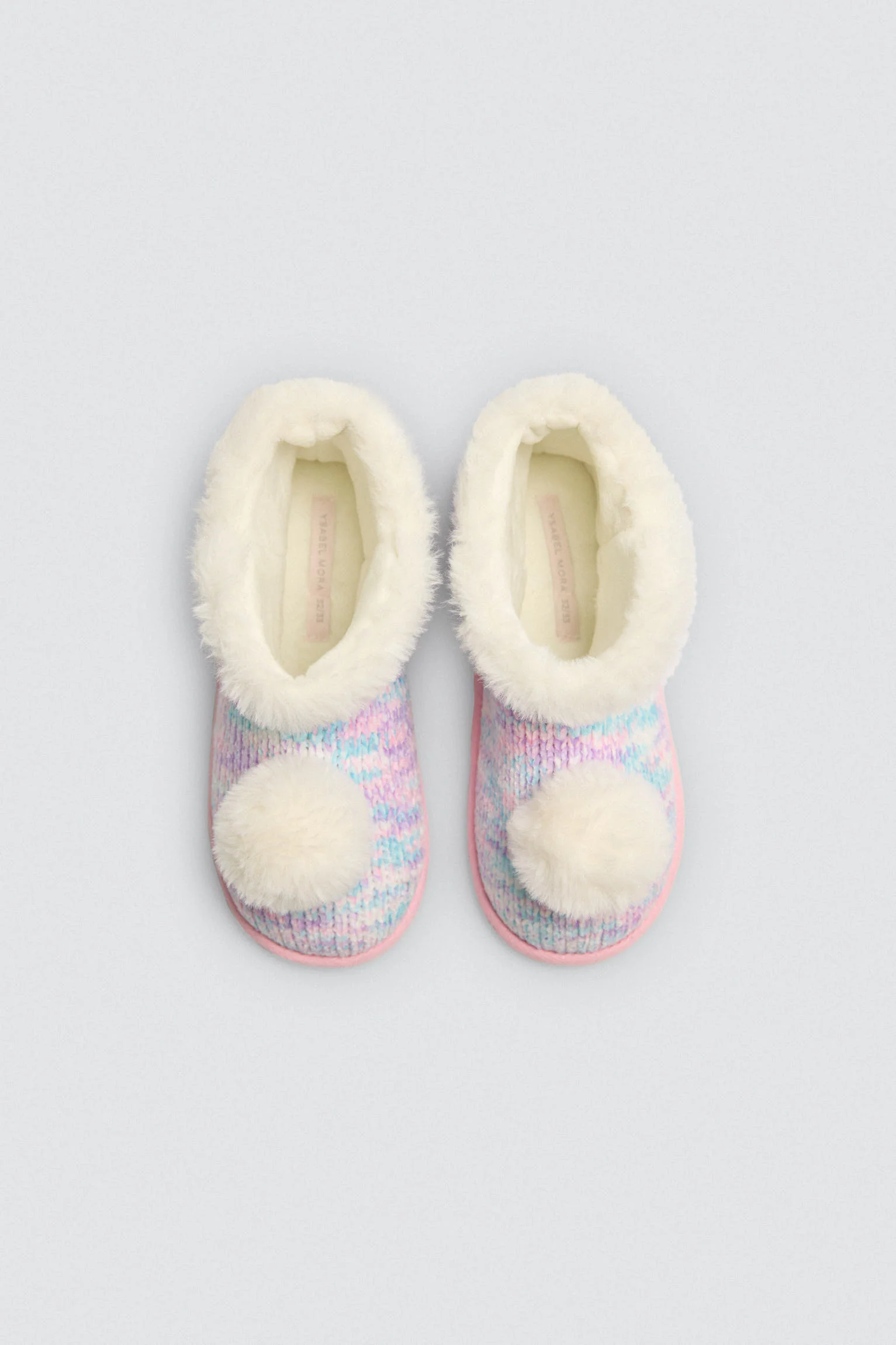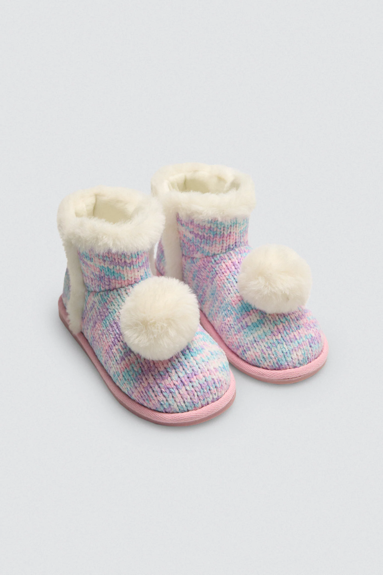 Queste adorabili pantofole per bambini presentano un esterno in morbida pelliccia con sfumature pastello e un bordo in pelliccia bianca per un tocco di calore in piรน. I pompon bianchi sulla tomaia aggiungono un design giocoso e accogliente. Con un interno in peluche, assicurano comfort e morbidezza a ogni passo.