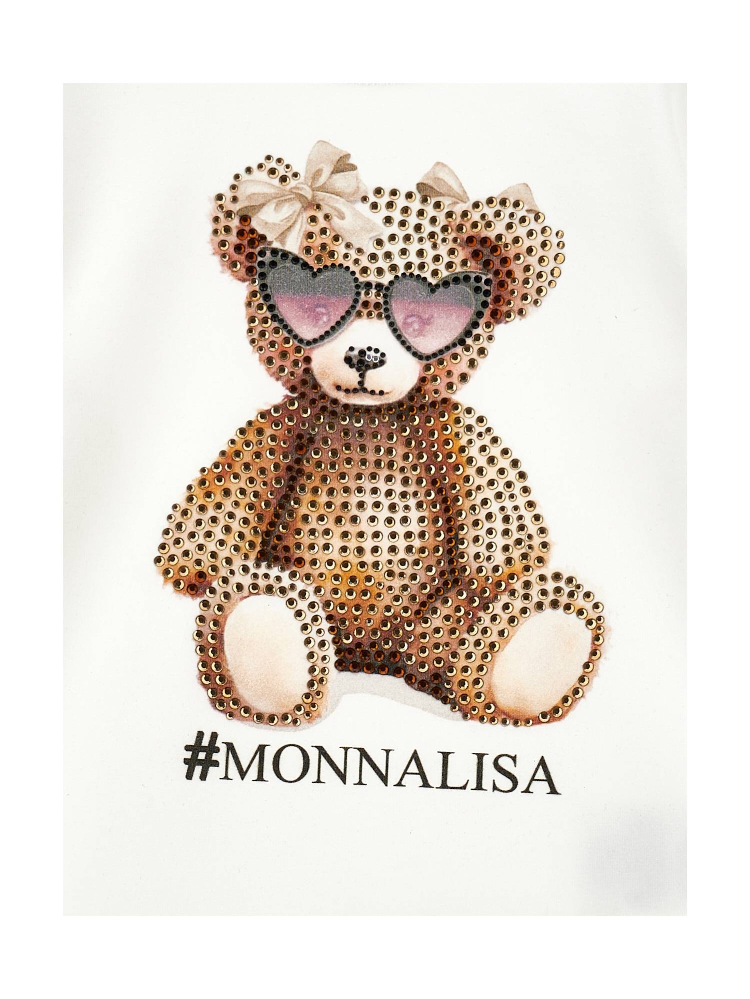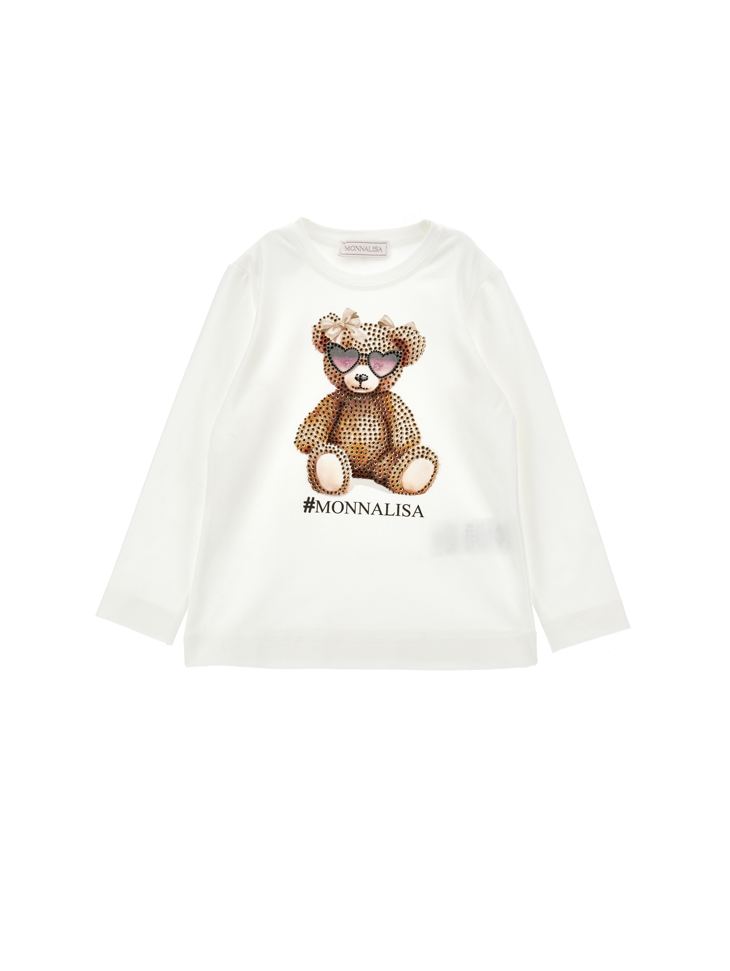 T-shirt per bambina Monnalisa. Il prodotto presenta un colore bianco, stampa con illustrazione Teddy Bear con strass , dettagli: logo centrale, scollo rotondo, maniche lunghe.