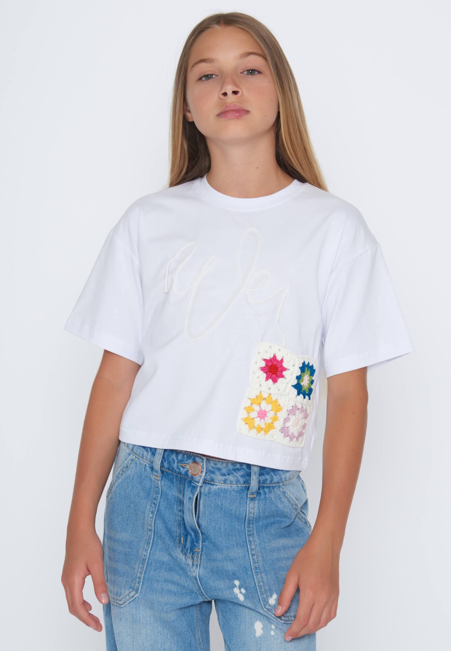 T-shirt cropped con ricamo a fantasia, un dettaglio che dona un tocco speciale al tuo stile.