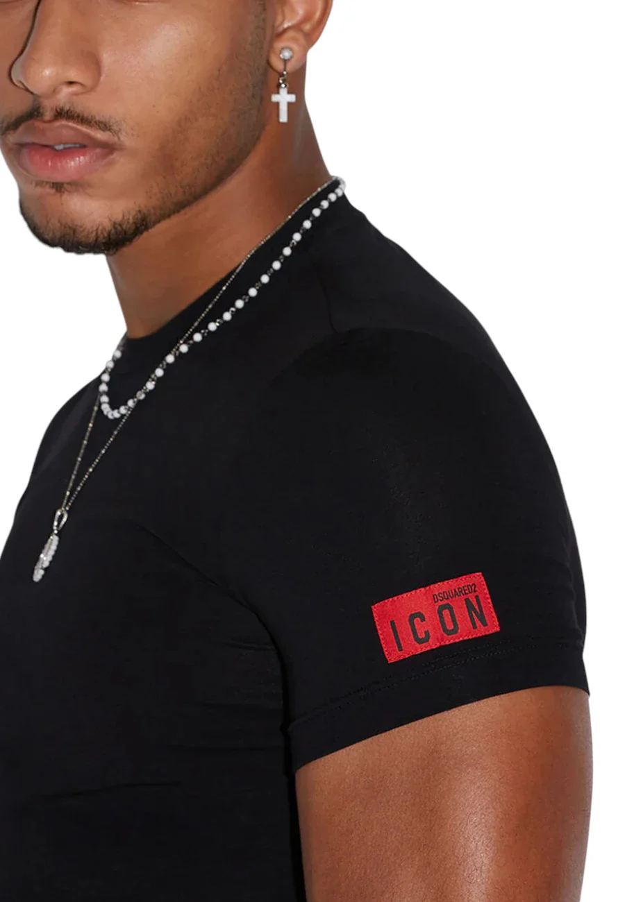 T-shirt BE ICON coln vestibilitร slim e patch con lettering ”DSQUARED2 ICON” rosso sulla manica. Made in Italy 89% cotone 11% elastan