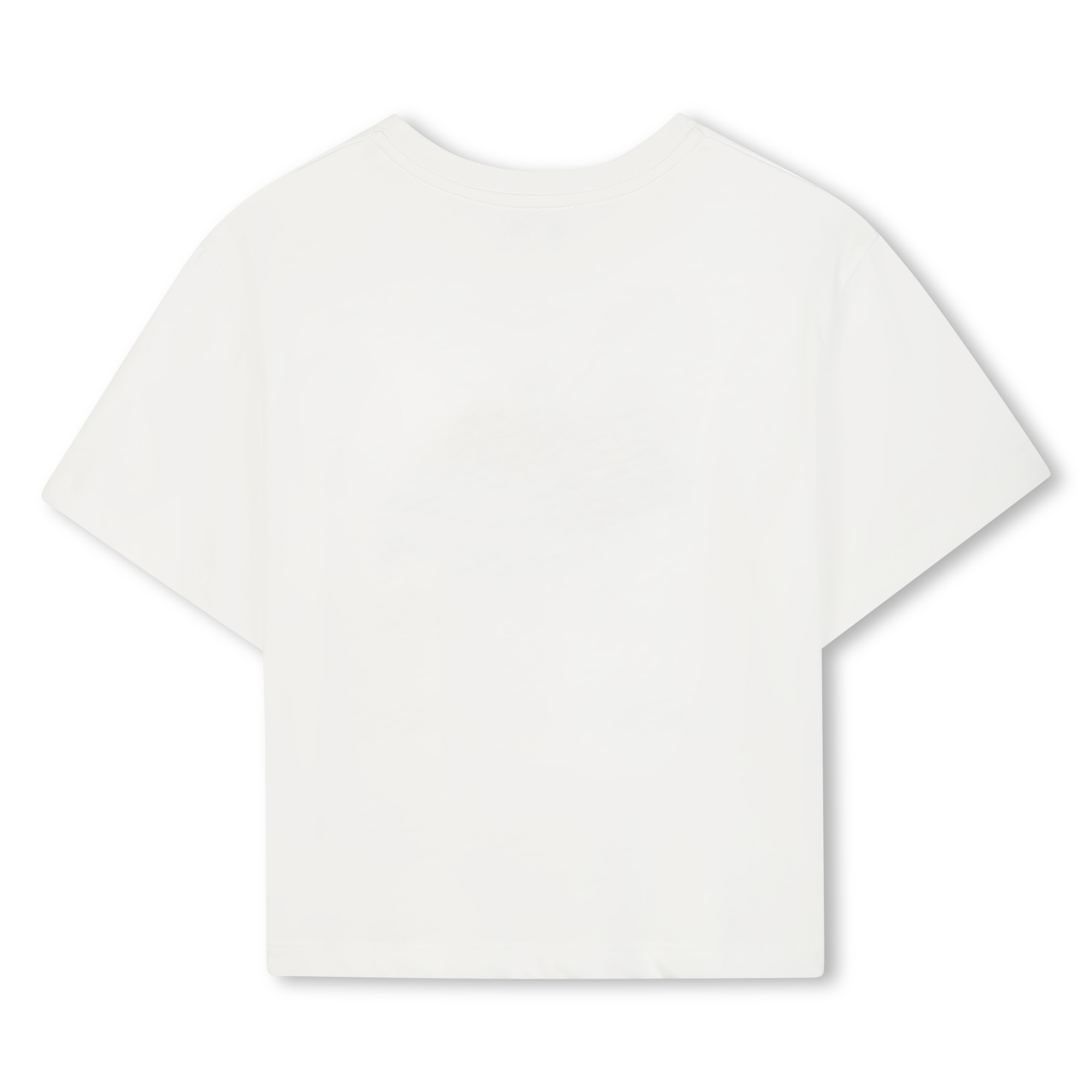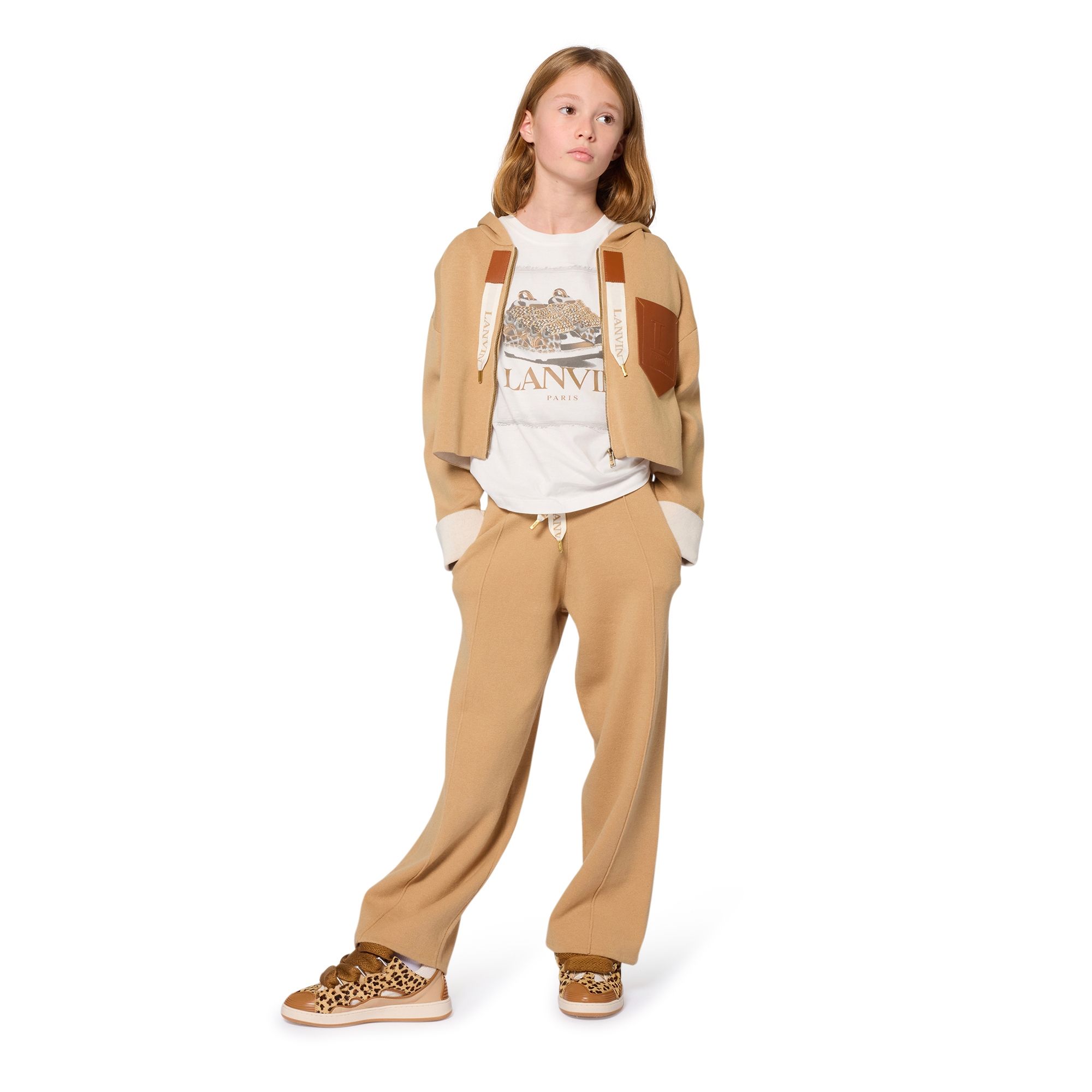 T-shirt bambina/ragazza cotone 100%, manica corta, base colore panna con patch stampata Lanvin e sneakers sul davanti, girocollo, orlo dritto.