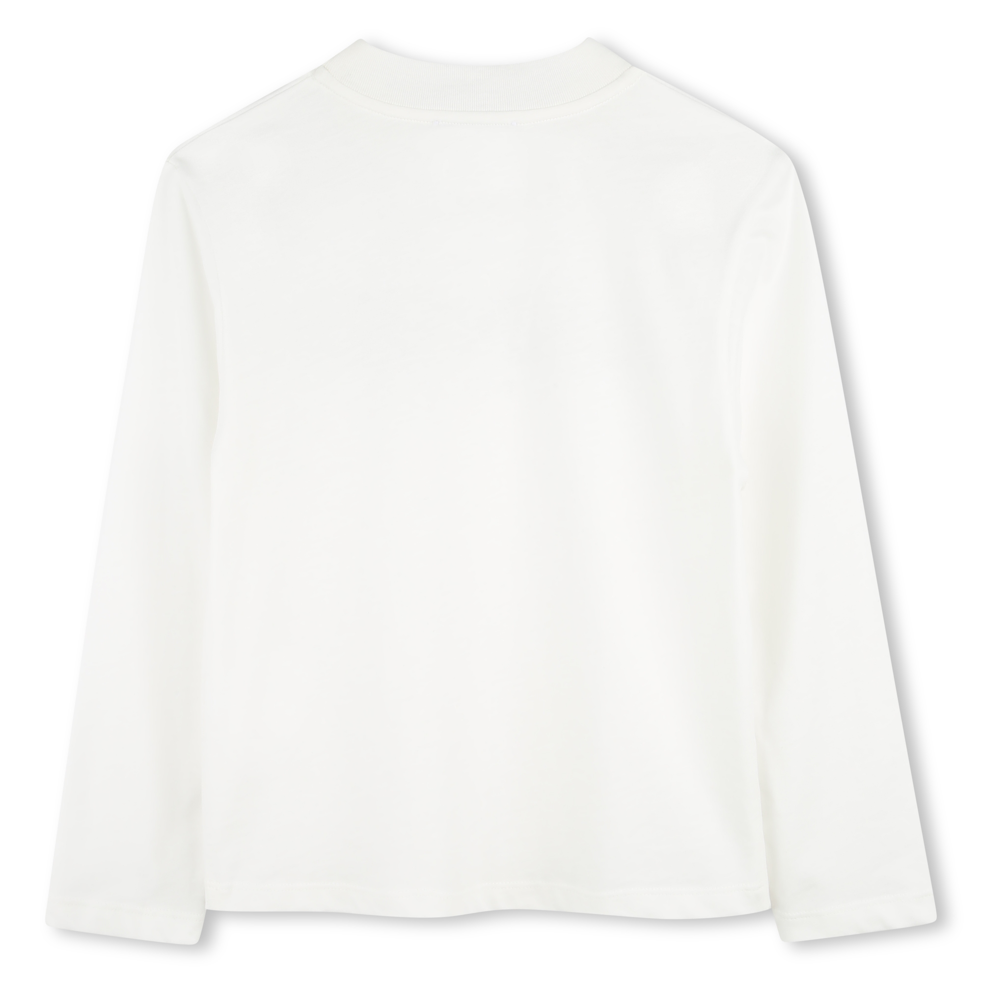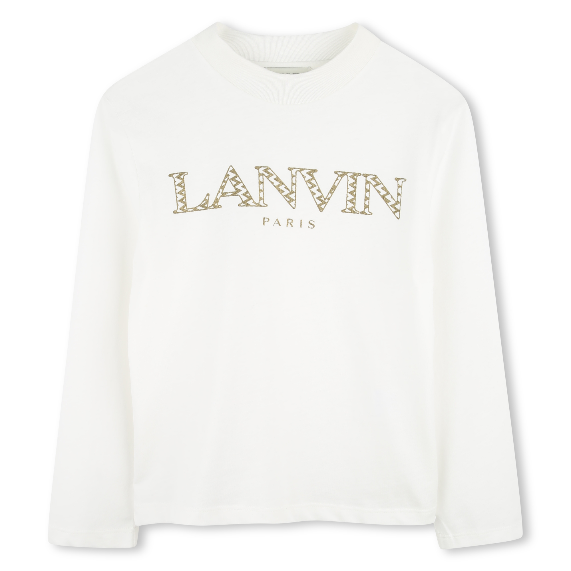 T-shirt bambina/ragazza cotone 100%, manica lunga, base colore panna con ricamo logo Lanvin sul davanti, girocollo, orlo dritto.