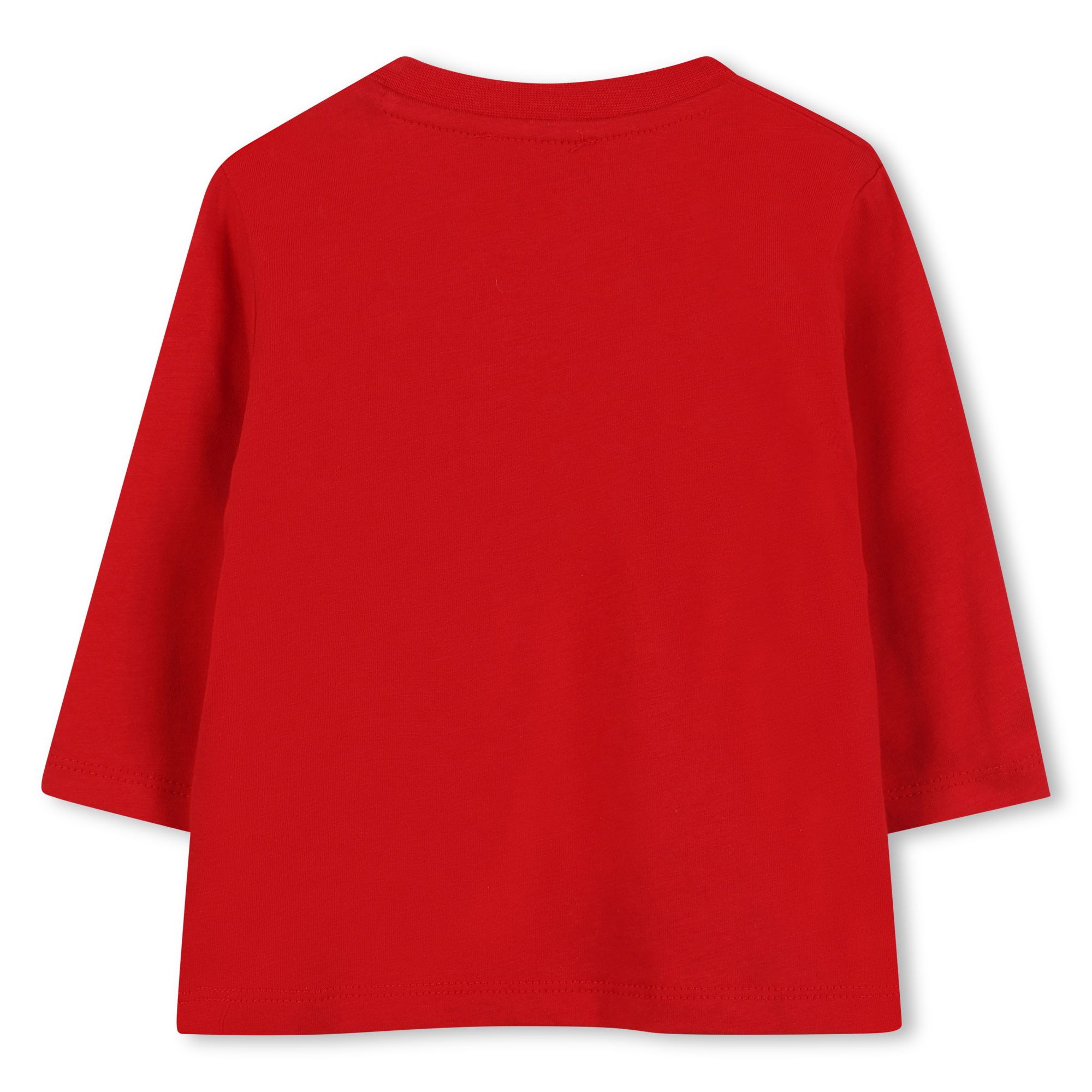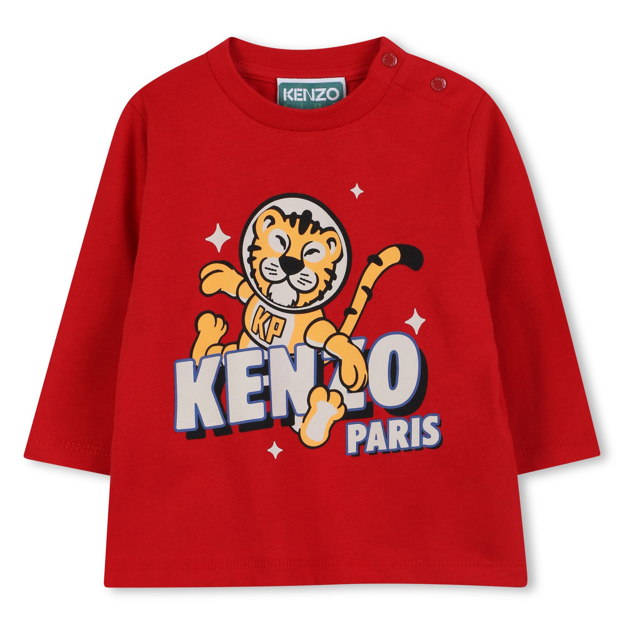 T-shirt rossa in cotone organico, a maniche lunghe, con gircollo a costine e chiusura con bottoni automatici sulla spalla. ร decorata con stampa tigre e logo sulla parte anteriore.