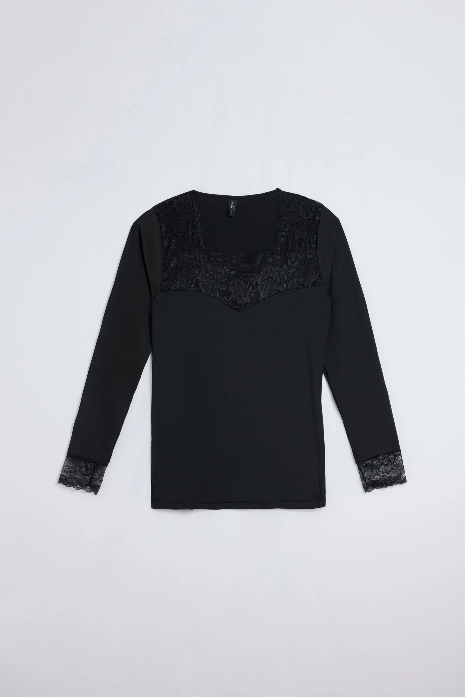 T-shirt nera in pizzo a maniche lunghe con scollo e polsini