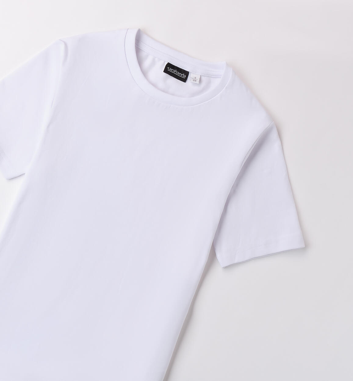 T-Shirt per ragazzo Sarabandaย realizzata in jersey stretch di cotone. Il modello รจ in fantasia tinta unita.