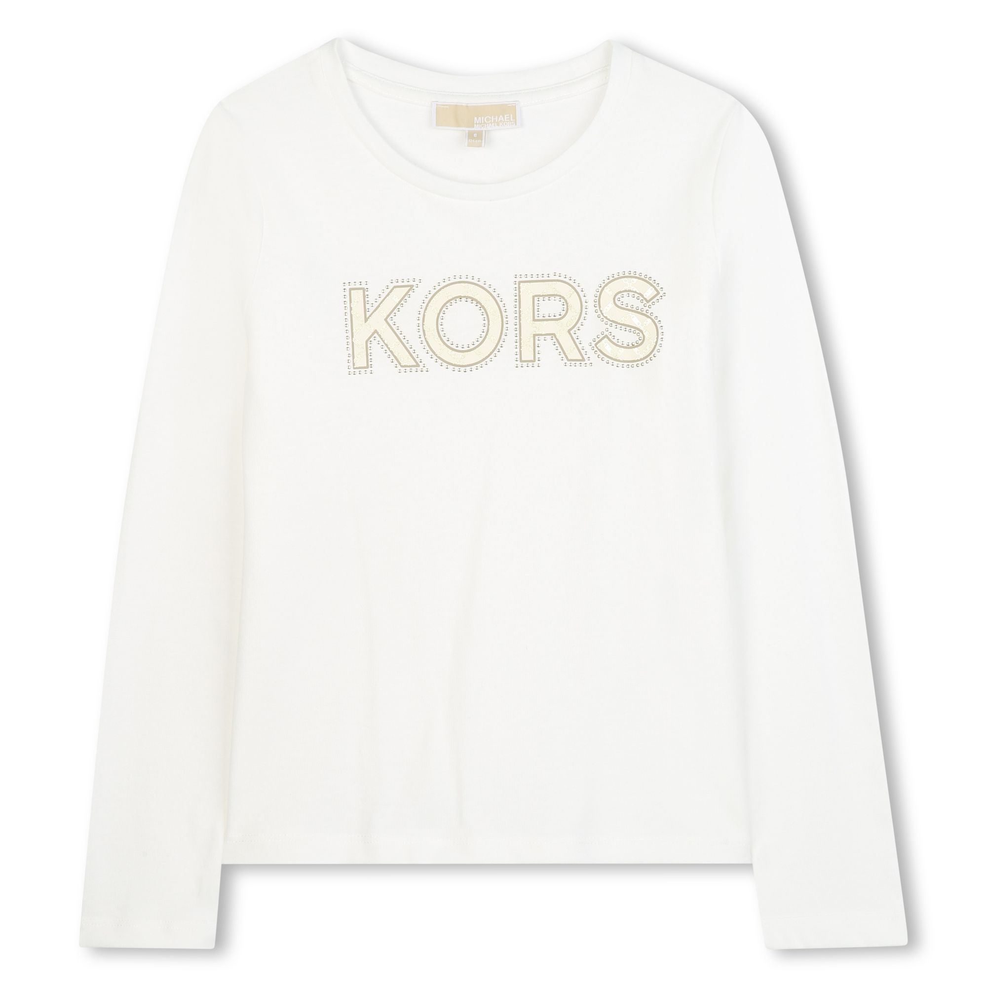 T-shirt per bambine e ragazze Michael Kors Kids. Realizzato in cotone 100%. Il prodotto presenta un colore bianco, decorazione con logo centrale e mini borchie, scollo rotondo, maniche lunghe.