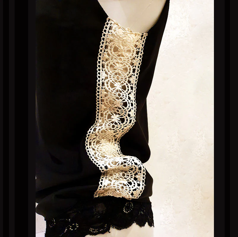 Prezioso top in delicato satin di raso con dettaglio asimmetrico in macramรจ applicati ad intarsio. Il sensuale gioco di trasparenza sulla sezione intarsiata regala a questo capo firmato Mecedora quel tocco di charme e personalitร tipico della griffe.