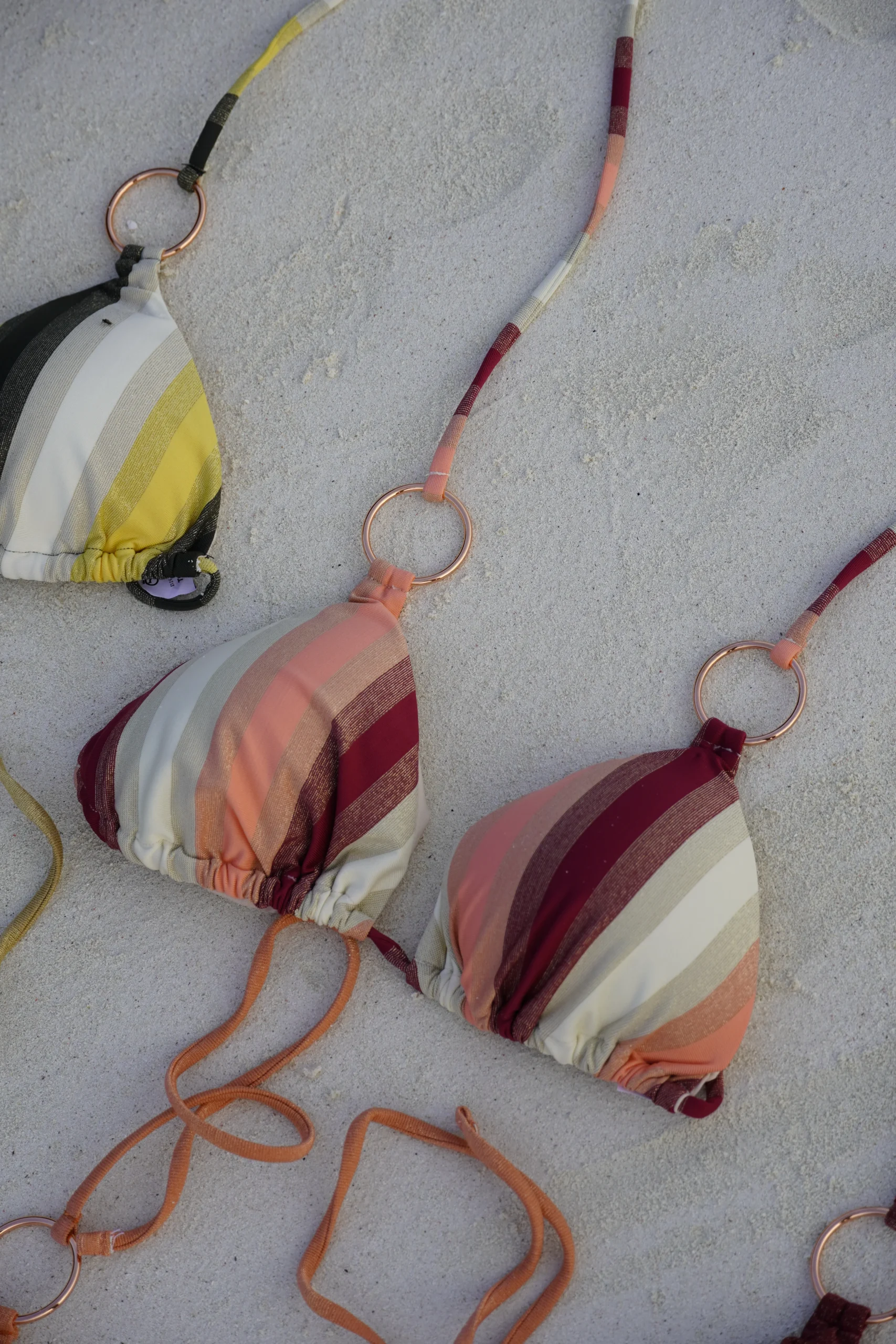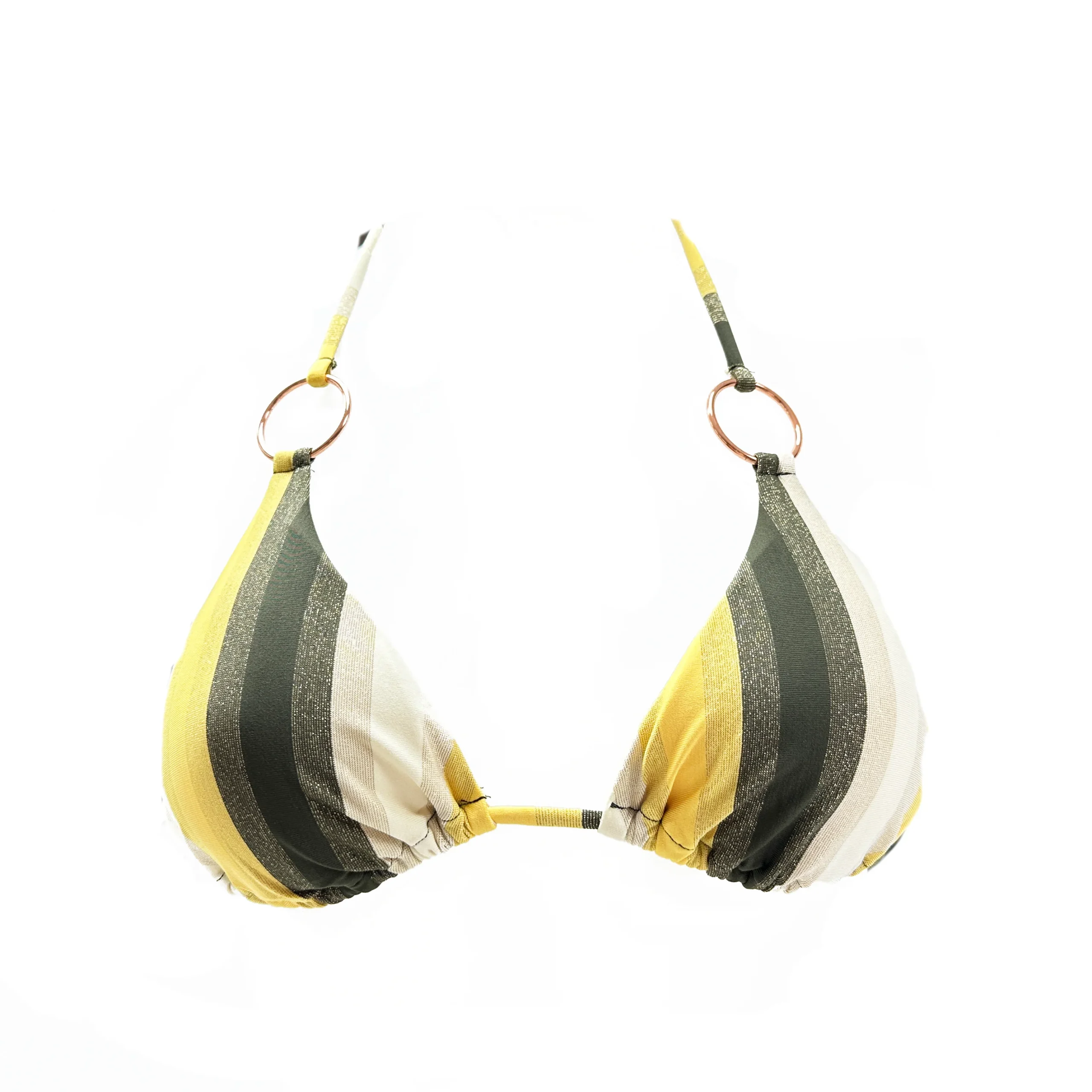 Triangolino imbottito con coppette estraibili, anelli alle due estremitร - Righe Burgundy e righe Verde. 80% Poliammide – 20% Elastan