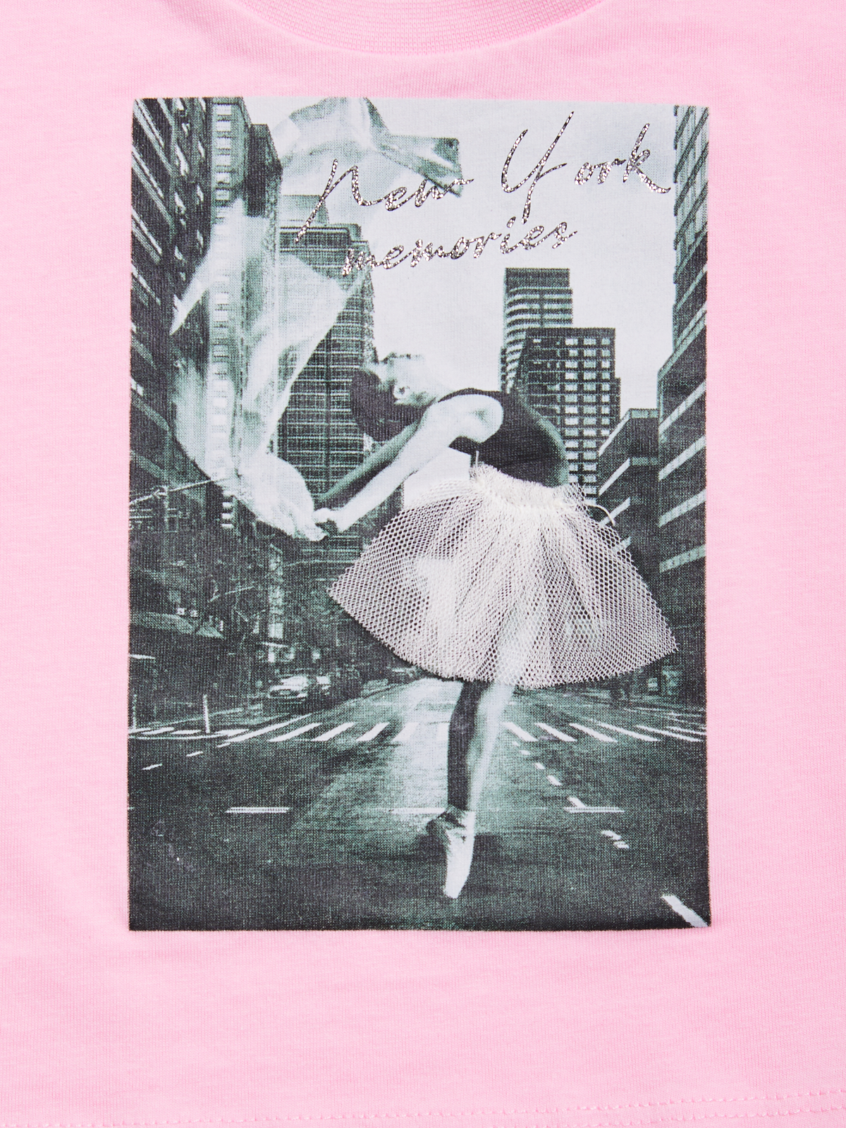 Tshirt corta e ampia in morbido cotone con manica corta. Stampa fotografica ballerina con tulle applicato. Un capo super sfizioso da abbinare alla bermuda in denim della collezione.