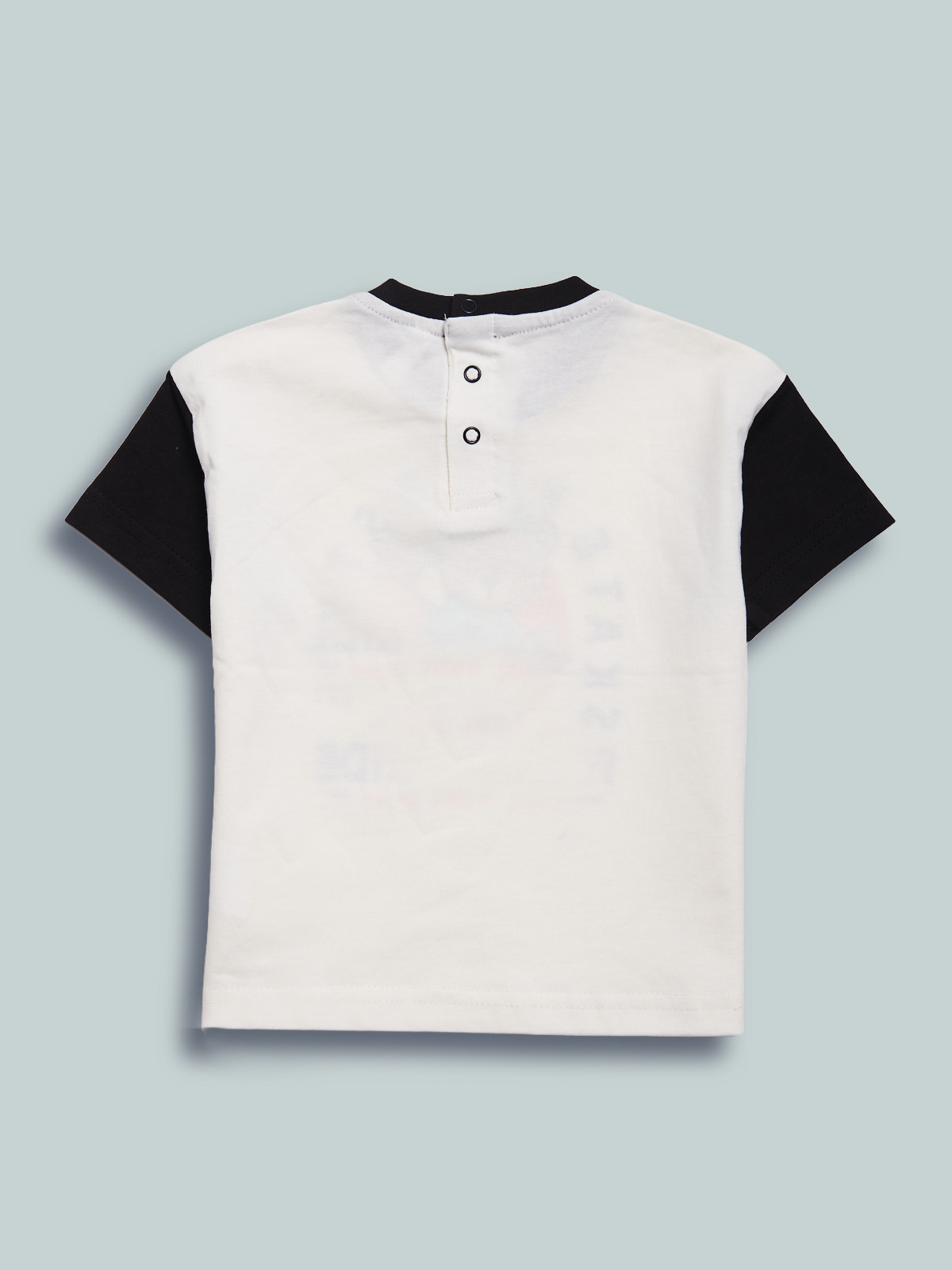 Tshirt girocollo in cotone con manica corta in contrasto. Pratica apertura con bottoncini a pressione sul retro, stampa colorata davanti. Un capo di tendenza da indossare con qualsiasi look.