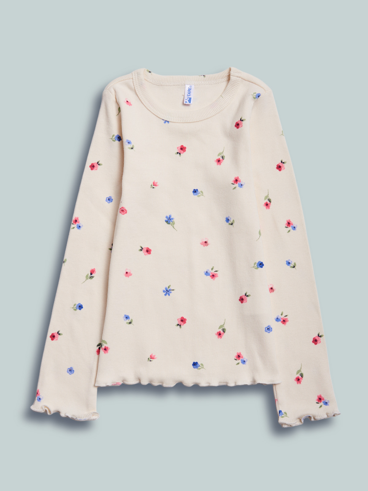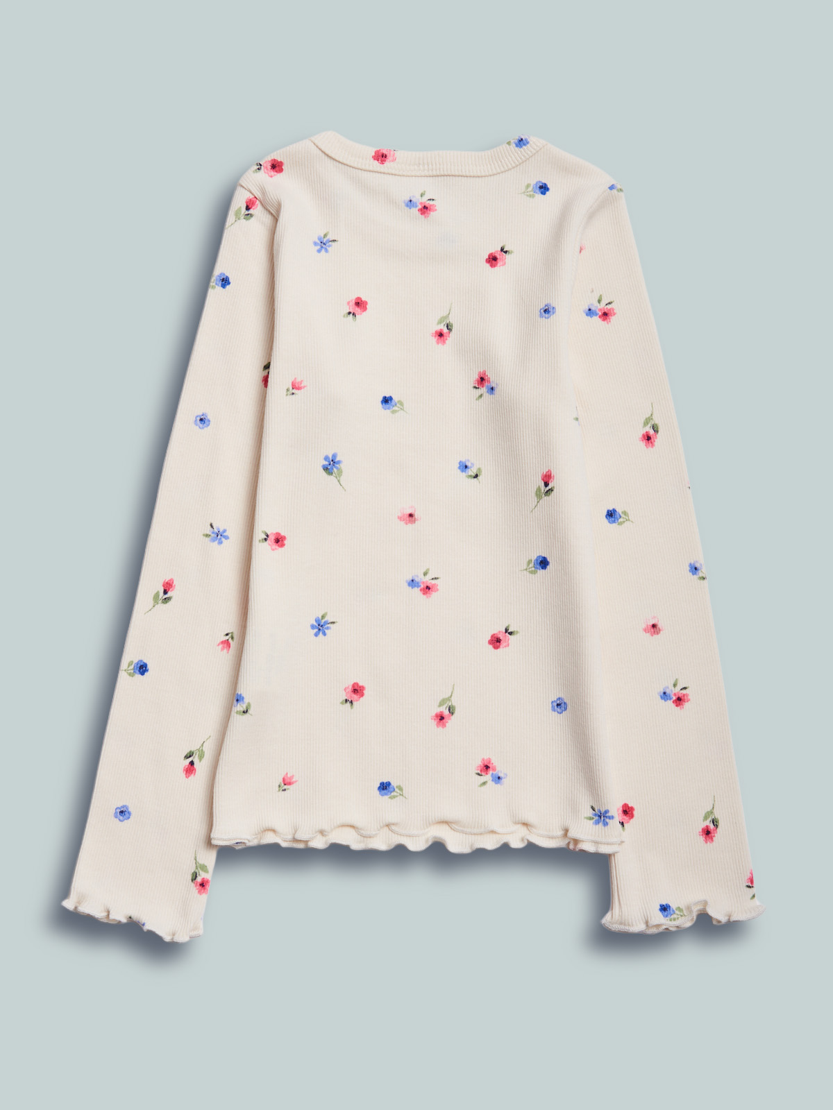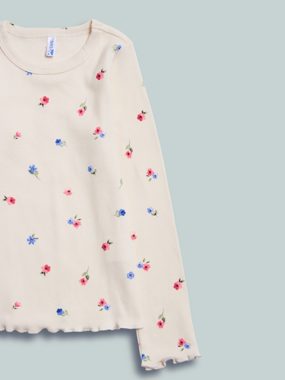 Tshirt manica lunga in costina fantasia fiorellini. Dettaglio rollรจ per fondo e fondo manica. Un capo sfizioso e alla moda.