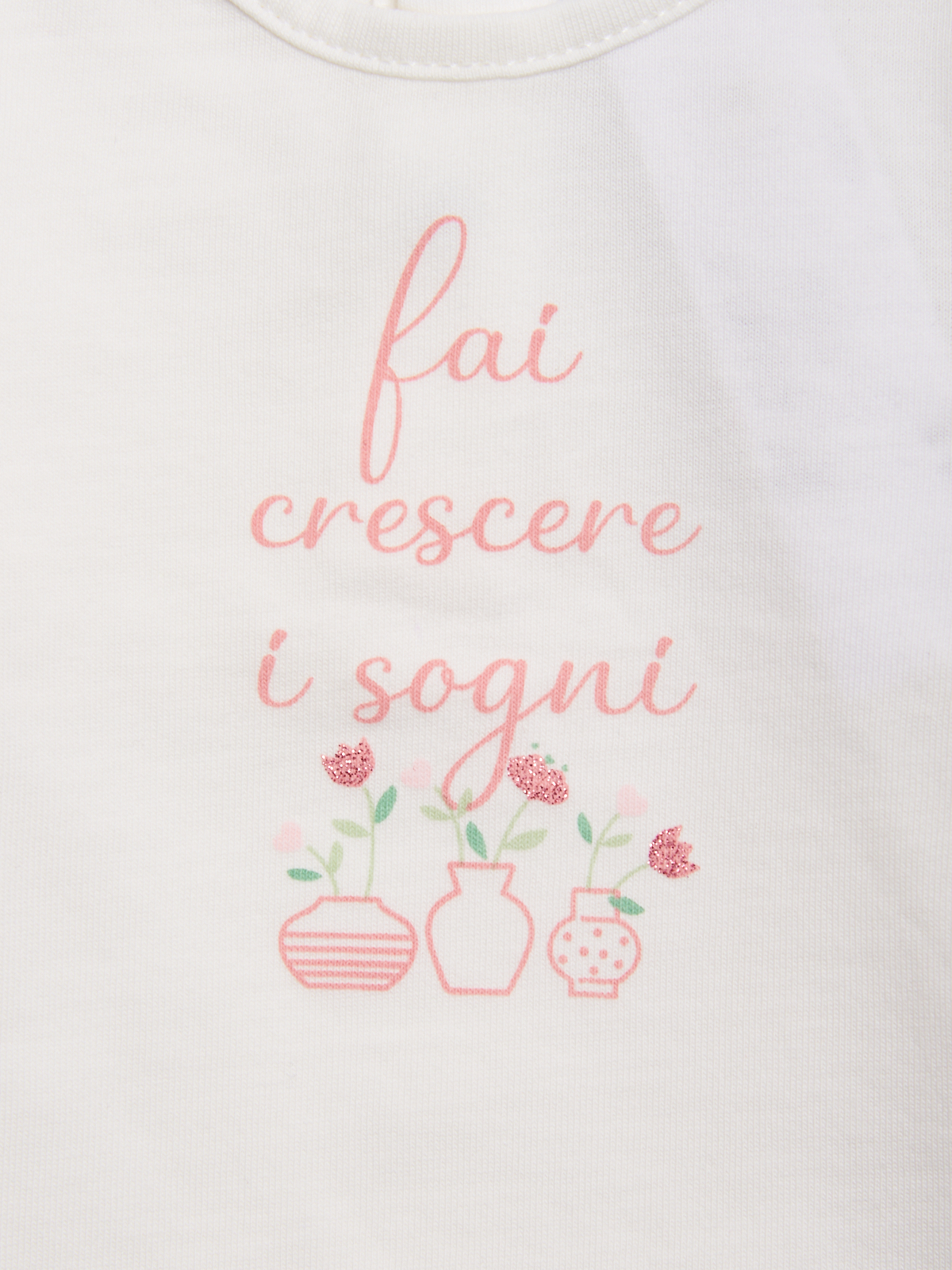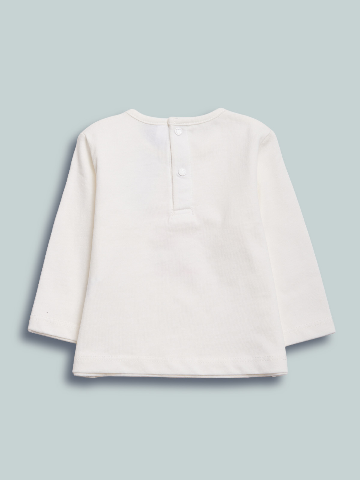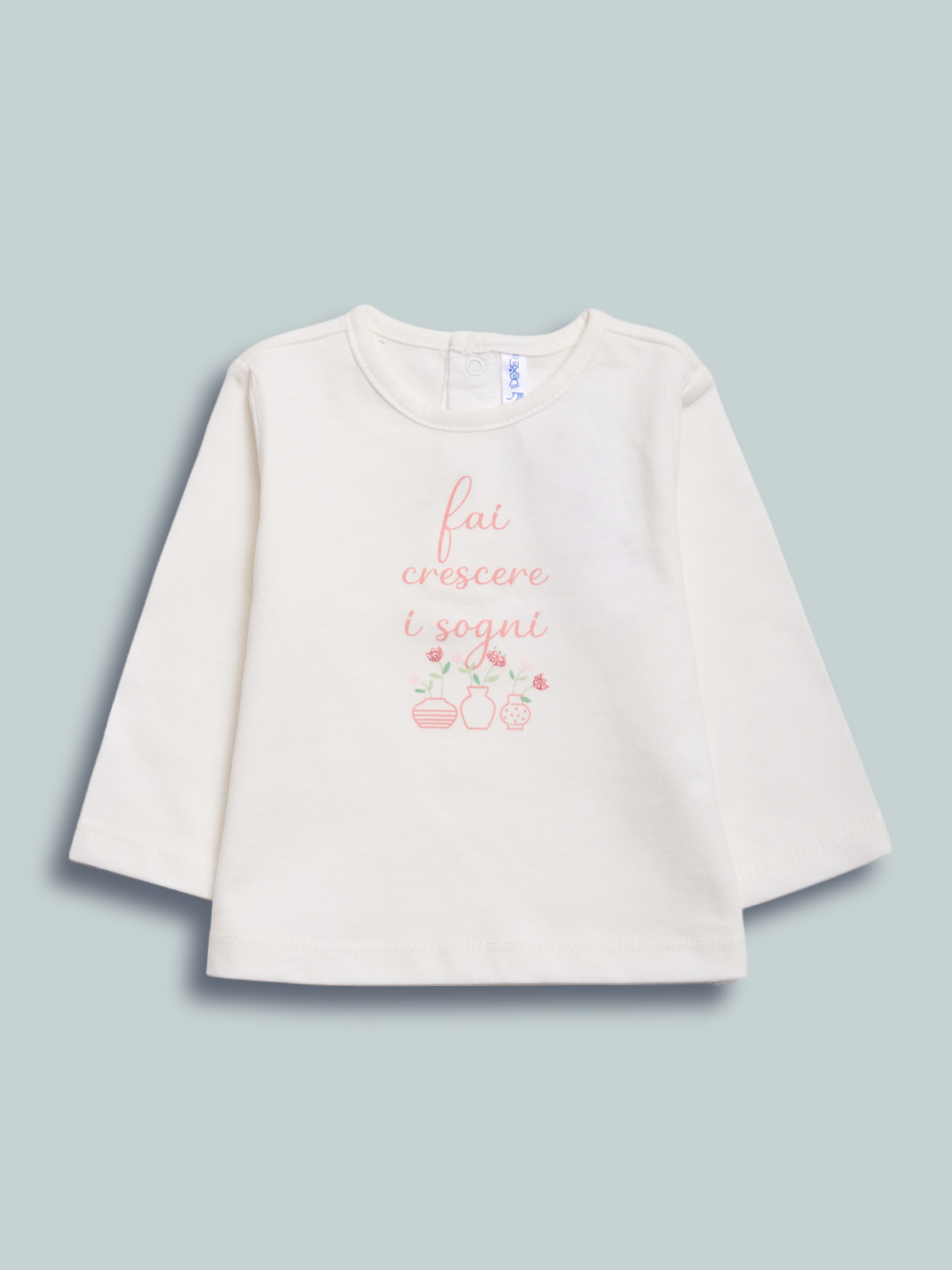 Tshirt girocollo a manica lunga in cotone. Pratica apertura sul dietro con bottoncini a pressione, stampa frontale. Un capo basico ideale da abbinare con facilitร a tutto il guardaroba.