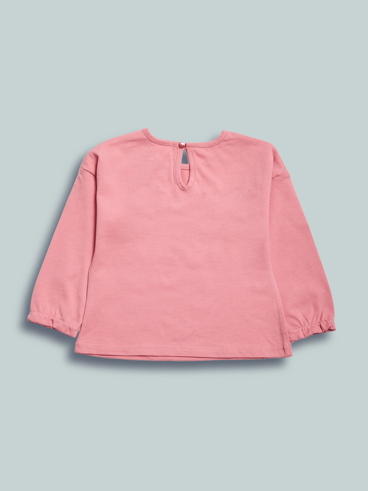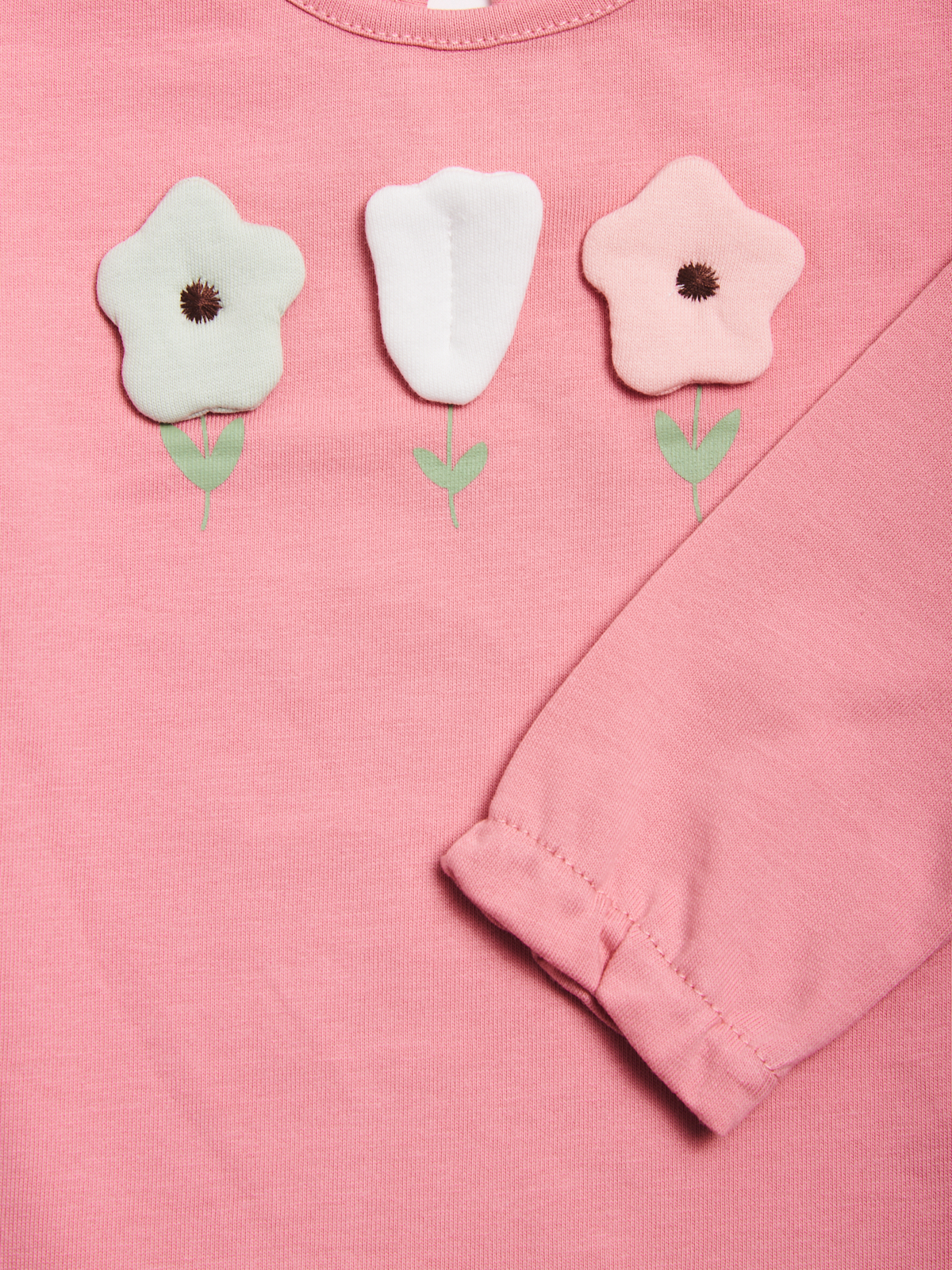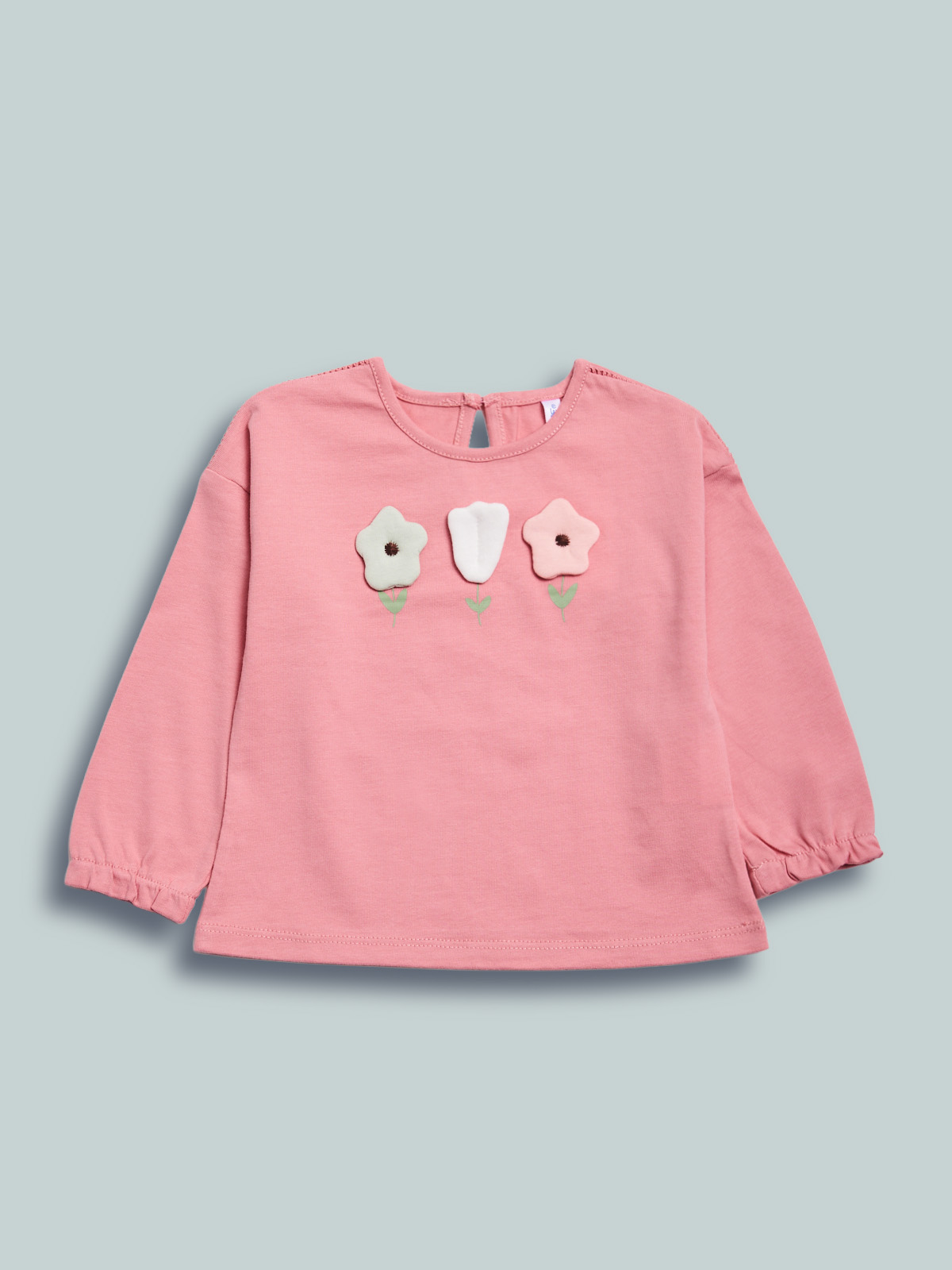 Tshirt in cotone manica lunga con pratica apertura sul dietro grazie ad un bottoncino. Simpatica stampa fiori con dettagli tridimensionali. Fondo manica con motivo arricciato. Un must have della stagione.