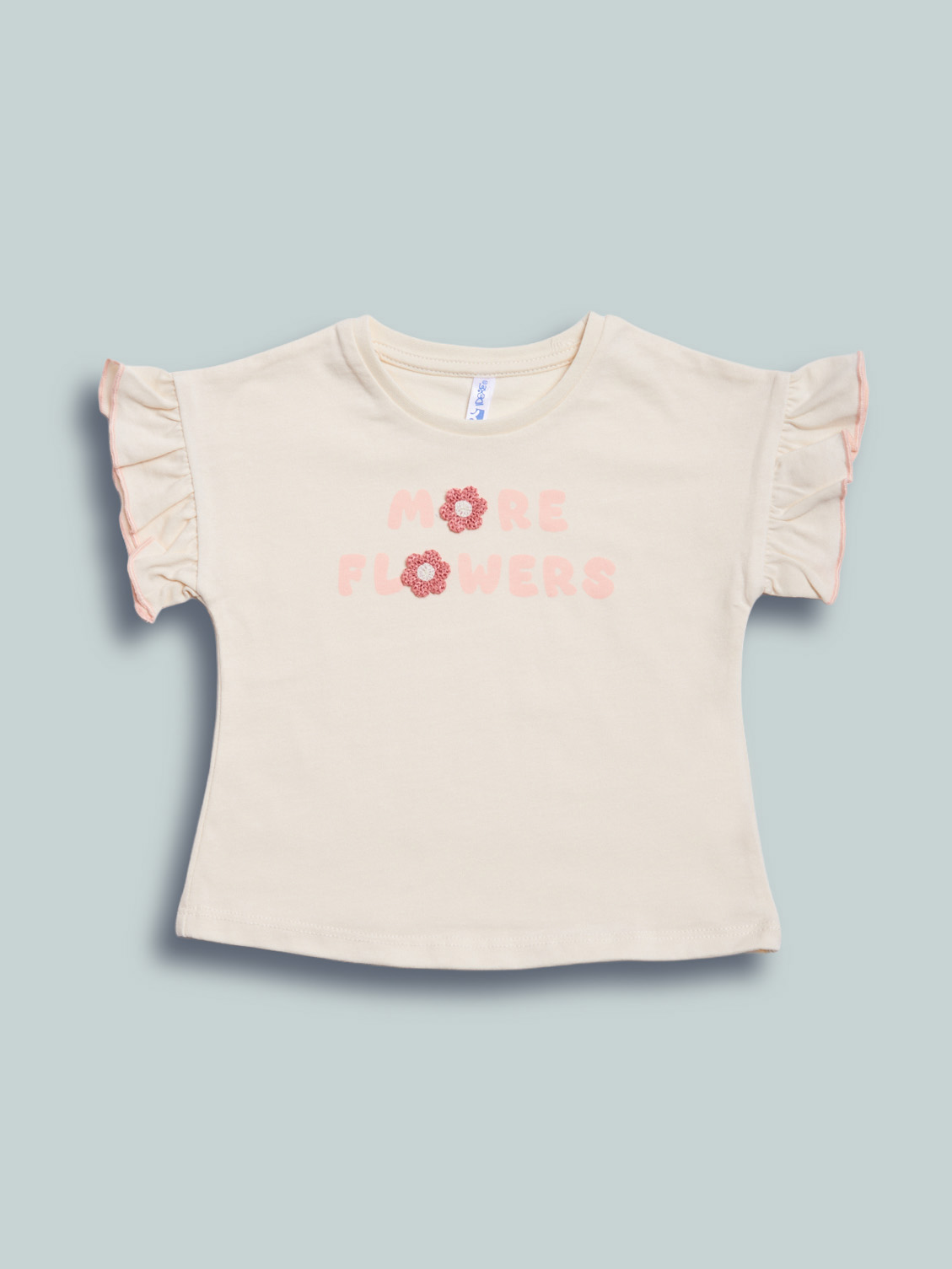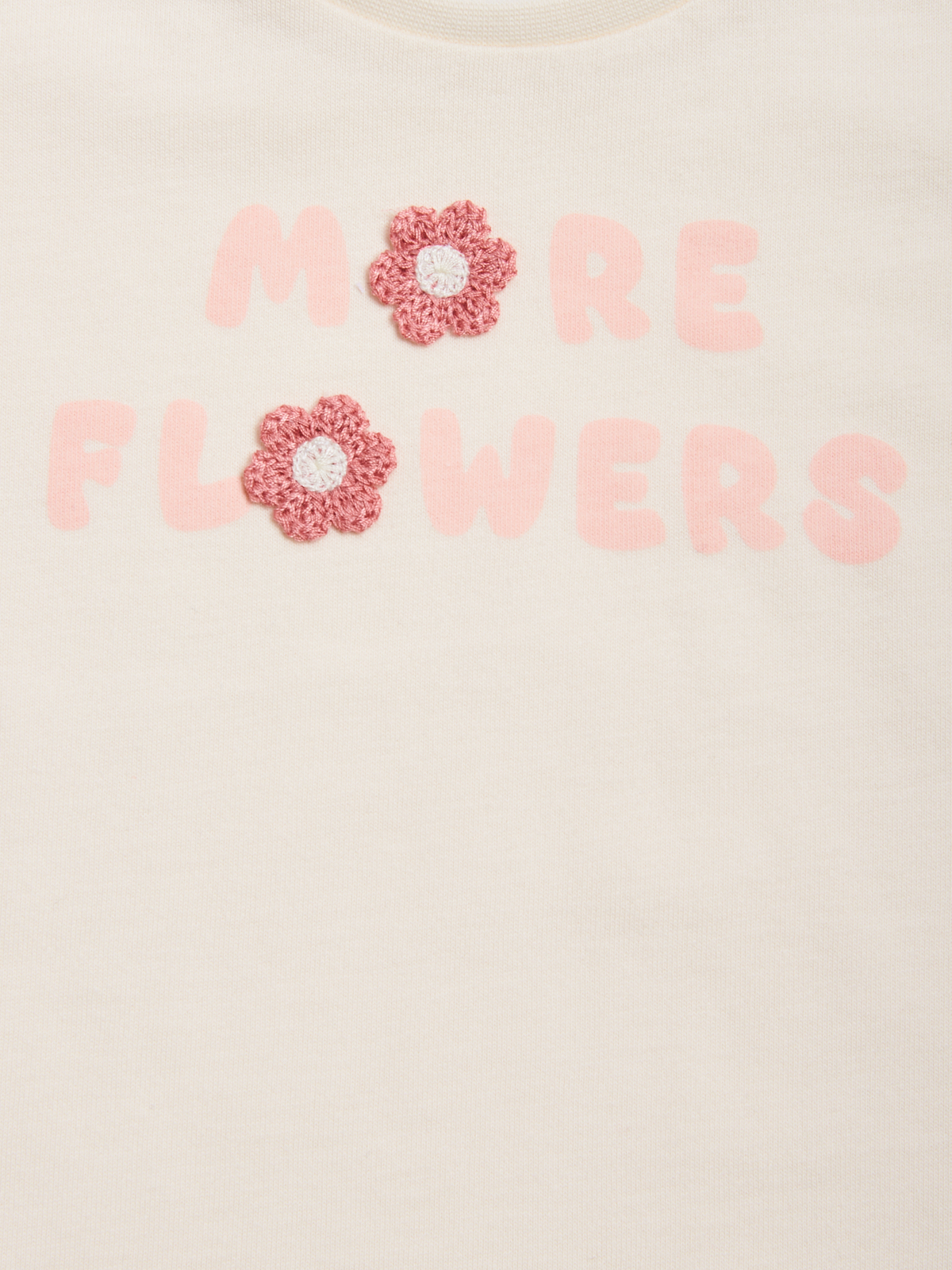 Tshirt in cotone manica corta con simpatica stampa lettering e fiori in applicazione tridimensionali. Un capo con dettagli fashion e di facile abbinamento.