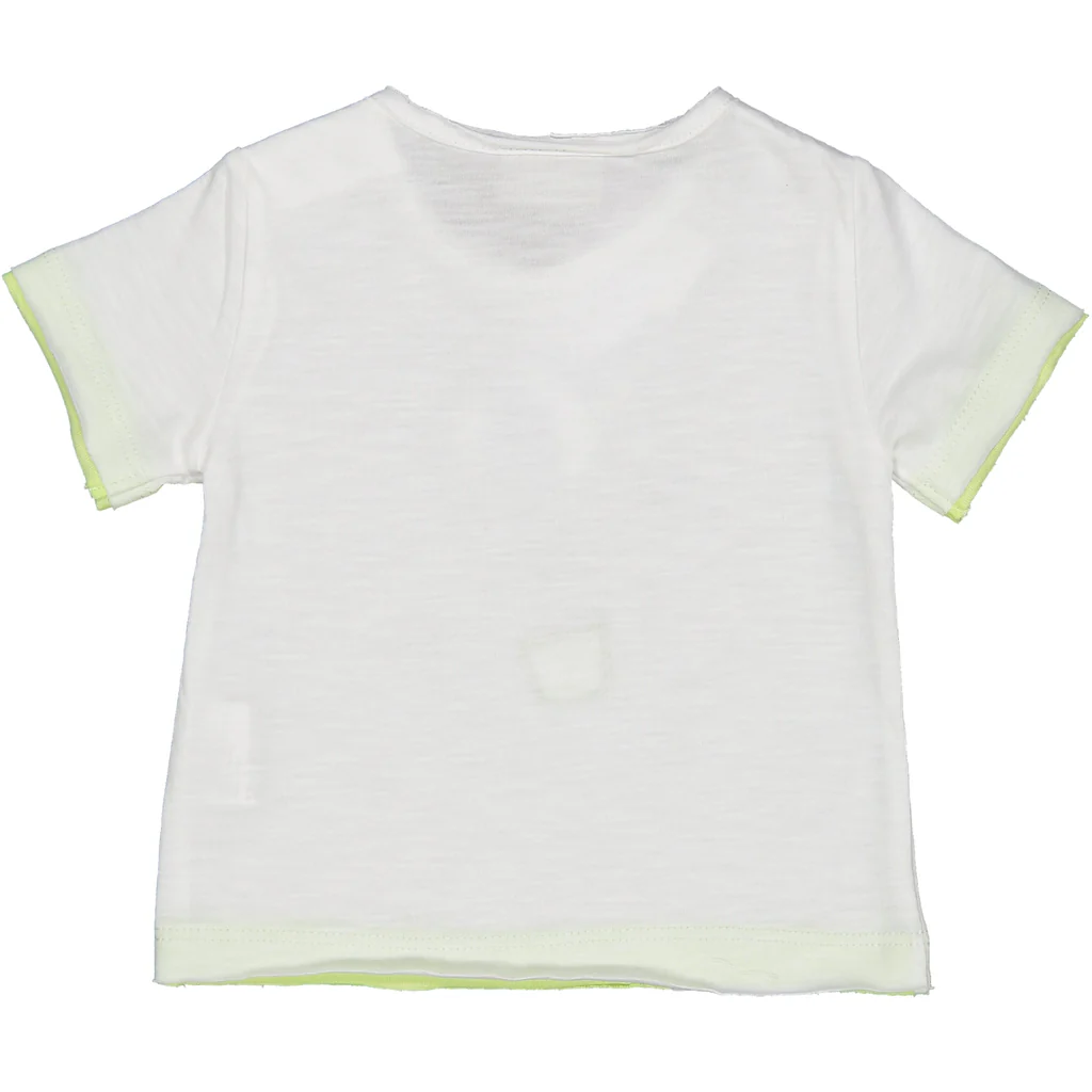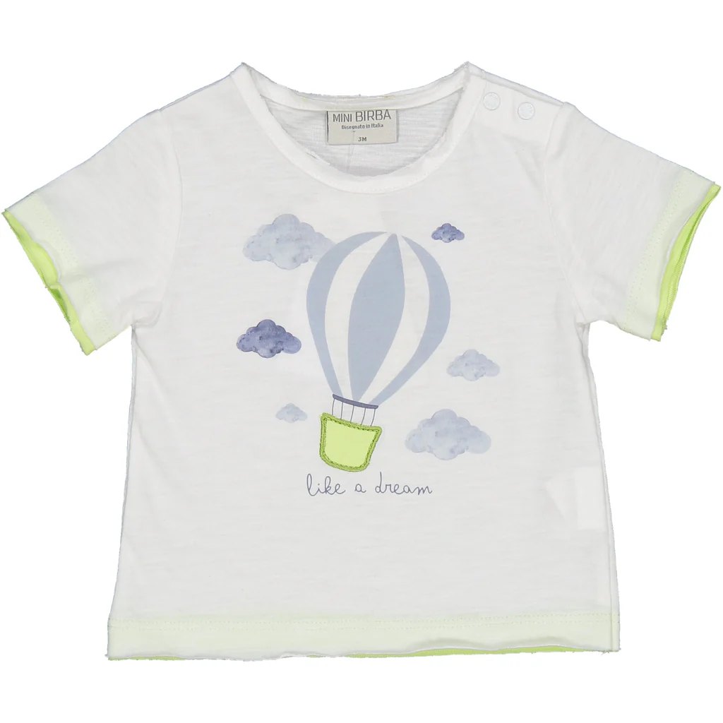 TSHIRT IN JERSEY DI COTONE MALFILE’ CON DETTAGLIO FINTO DOPPIO PER IL FONDO E LE MANICHE IN COLORE VERDE IN CONTRASTO. STAMPA MONGOLFIERA CON APPLICAZIONE SUL DAVANTI. BOTTONCINI AUTOMATICI SU SPALLA