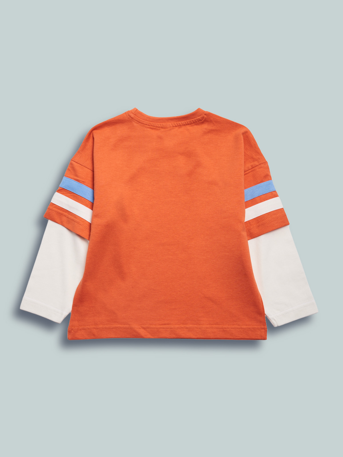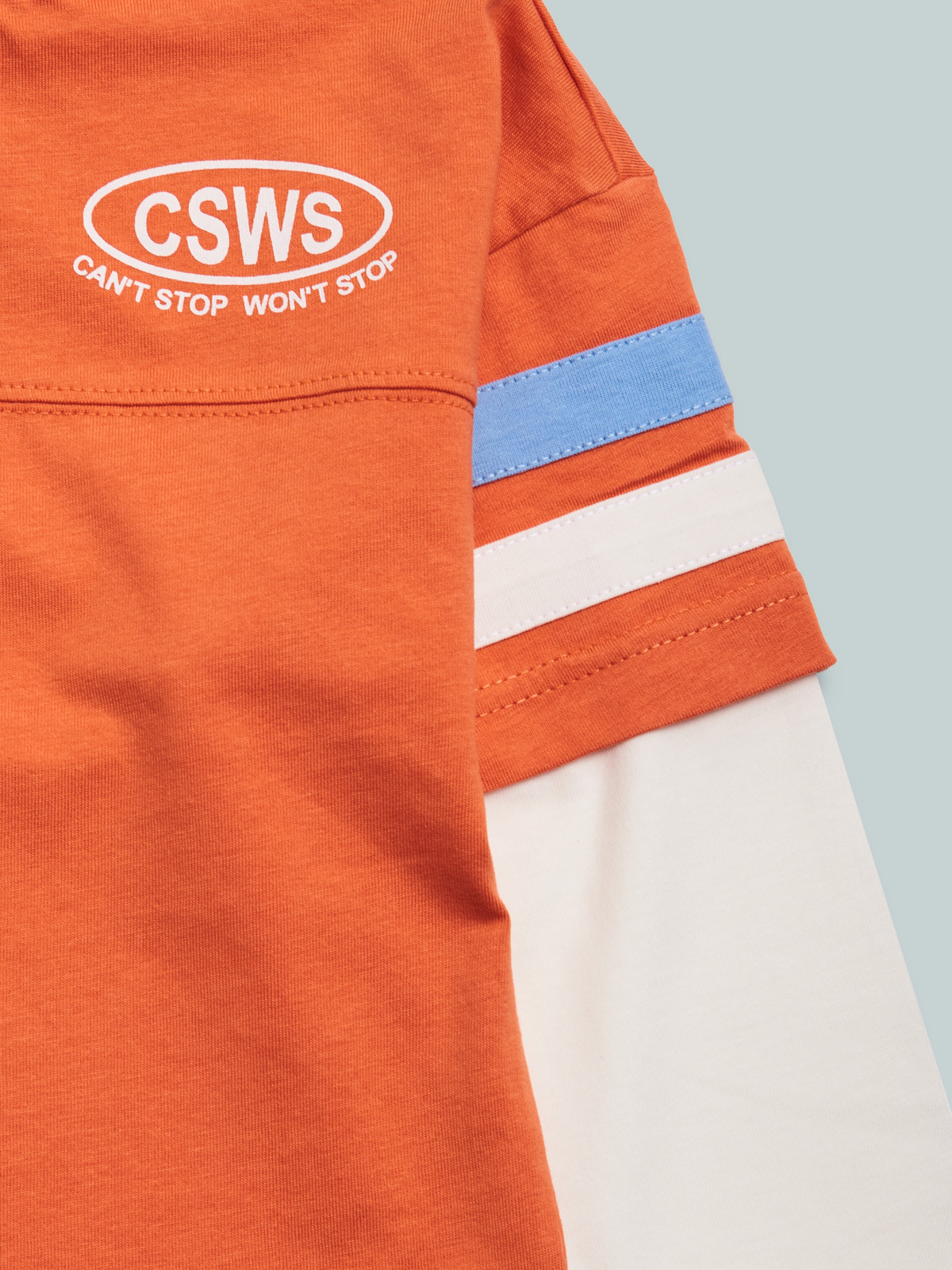 Tshirt manica lunga in cotone modello girocollo con vestibilitร over, maniche e dettagli in contrasto, stampa sul davanti. Un capo comodo e pratico, da indossare a scuola o nel tempo libero.