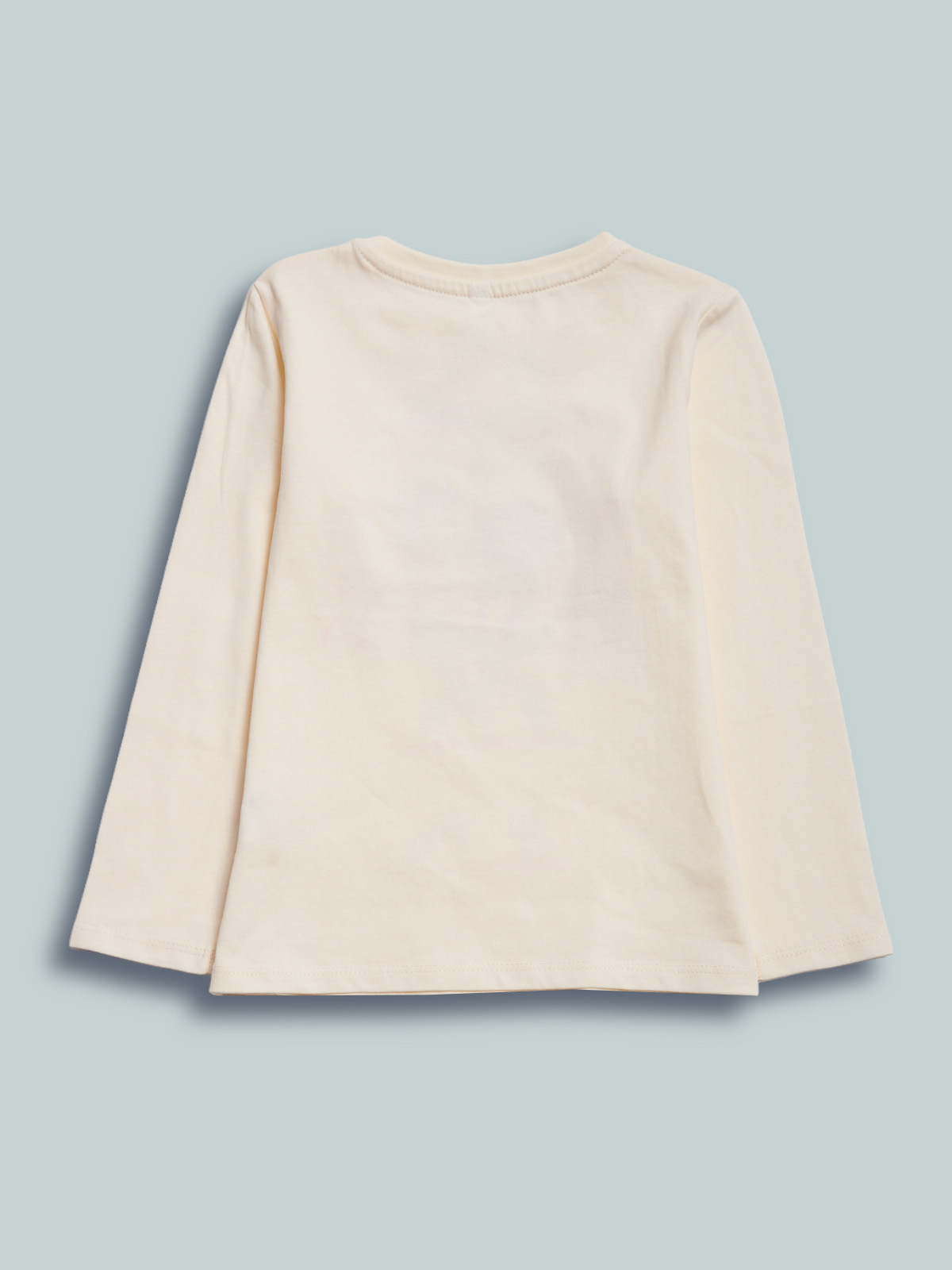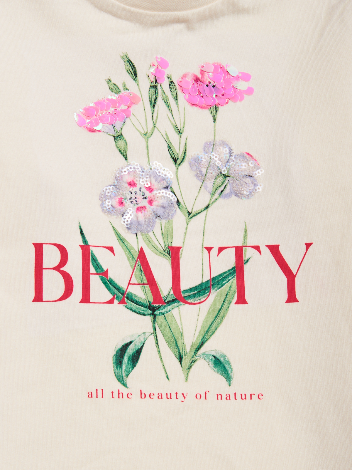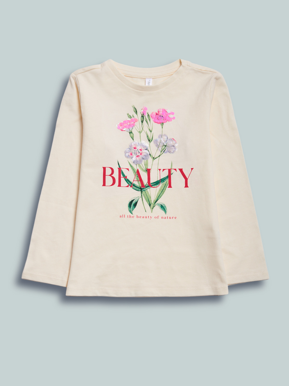 Tshirt manica lunga in morbido cotone con stampa fiori e paillettes rosa tridimensionali sul davanti. Una tshirt dal sapore romantico.