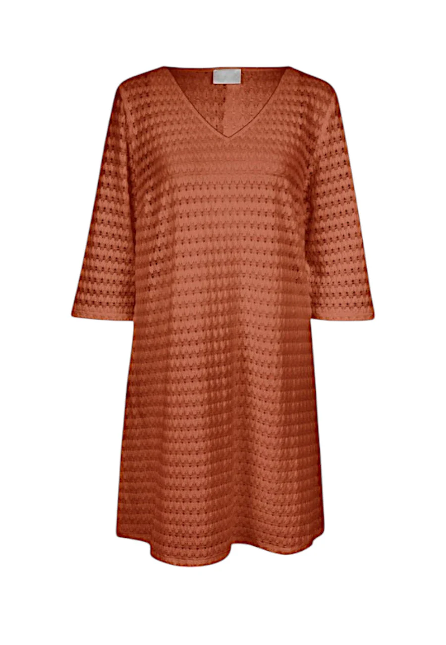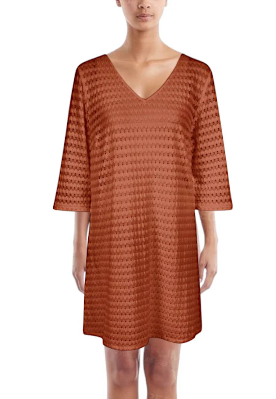 Abito copricostume con vestibilitร over. Fantastico color cotto con lavorazione effetto pizzo, elasticizzata. Questo abito unisce eleganza e praticitร grazie al suo design essenziale e femminile. Realizzato in un tessuto fluido ed elasticizzato, offre una vestibilitร confortevole che si adatta perfettamente alle linee del corpo. Perfetto per le giornate estive o per un look raffinato da vacanza, รจ un capo versatile che non puรฒ mancare nel guardaroba.