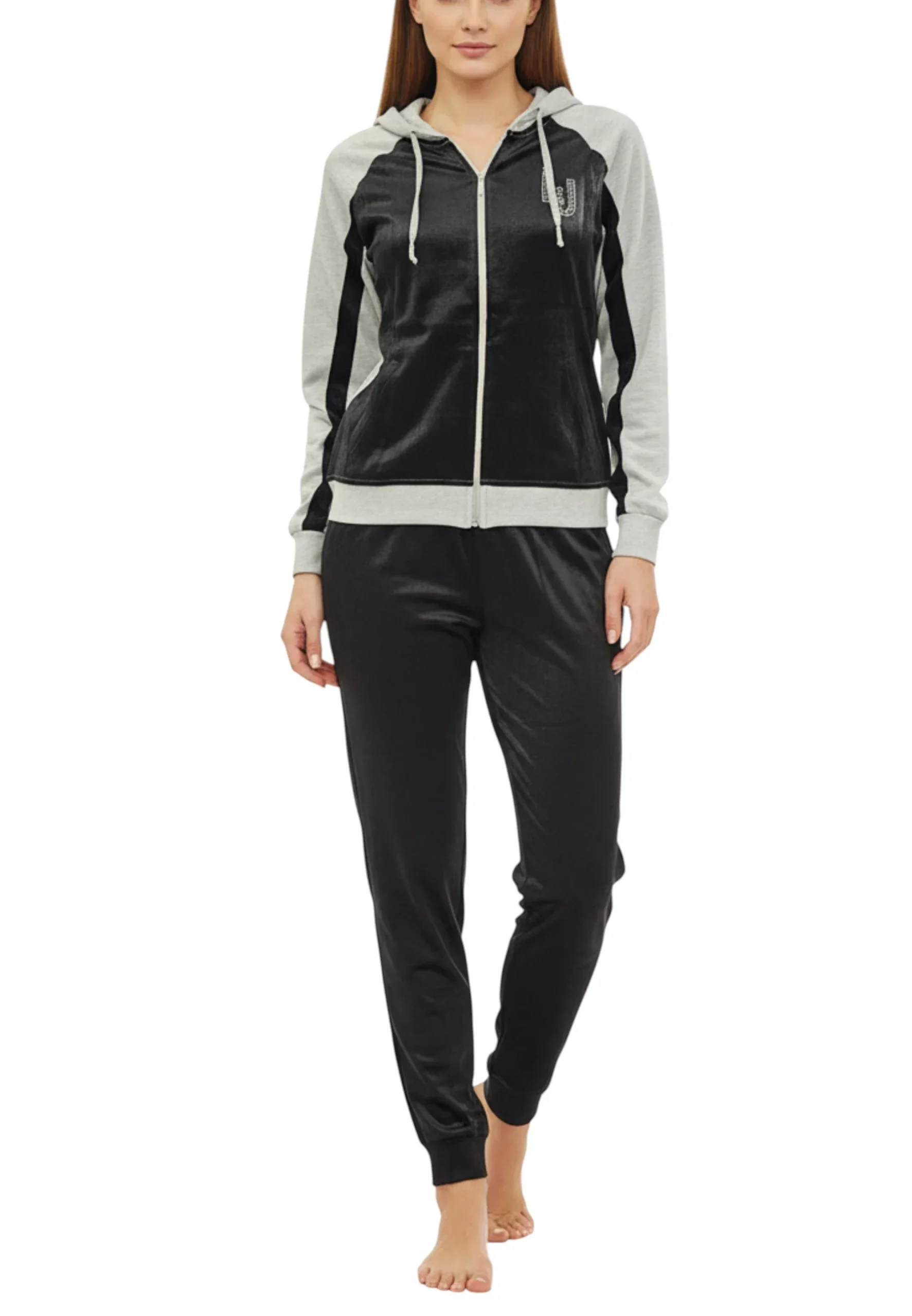 Elegante tuta con cappuccio con combinazioni di tessuti felpa e viscosa grigio e nero.
