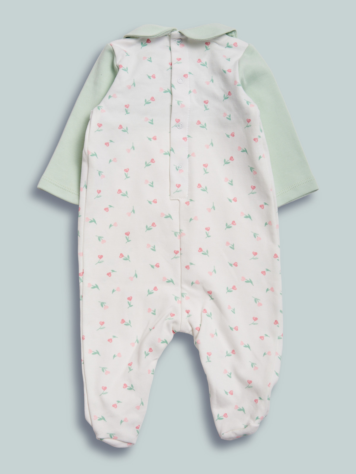 Deliziosa tutina in caldo cotone stampato fantasia con inserti in unito. Collo rotondo e l’arricciatura davanti rendono il capo molto femminile. Stampa davanti con glitter. Apertura dietro ed entrogamba con bottoni a pressione per agevolare l’indosso. Ideale da indossare tutti i giorni ed essere sempre alla moda.
