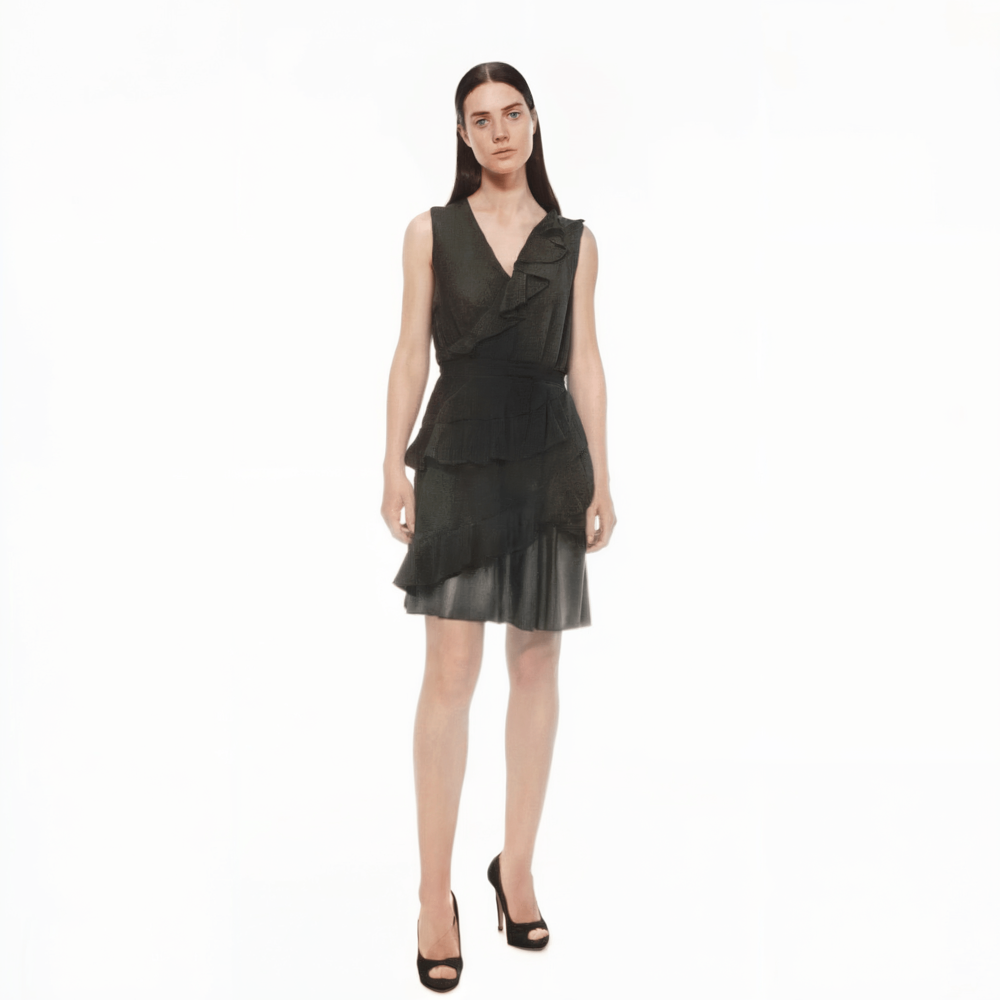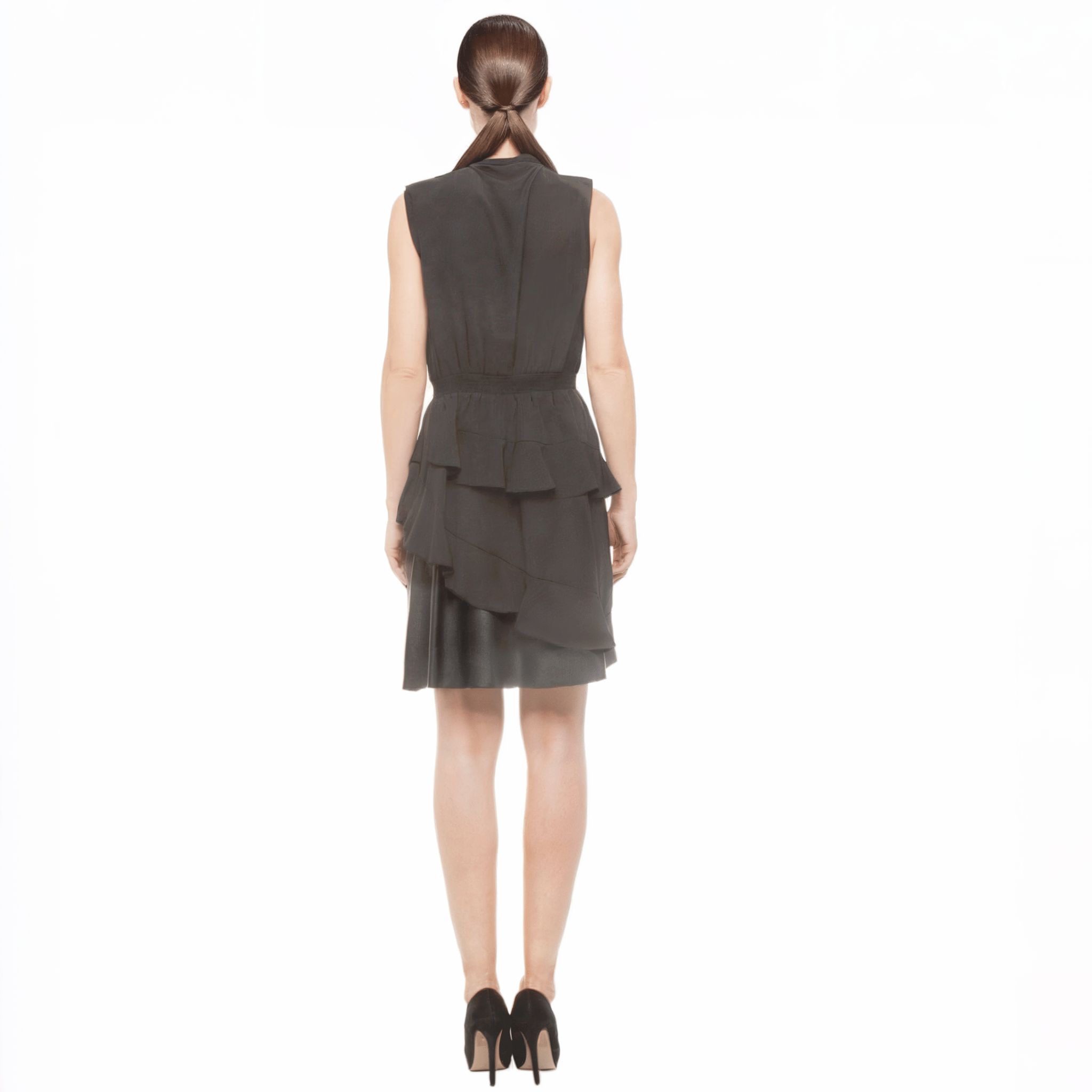 Dettagli: scollatura a V, colletto asimmetrico, fascia elastica in vita, fondo in ecopelle