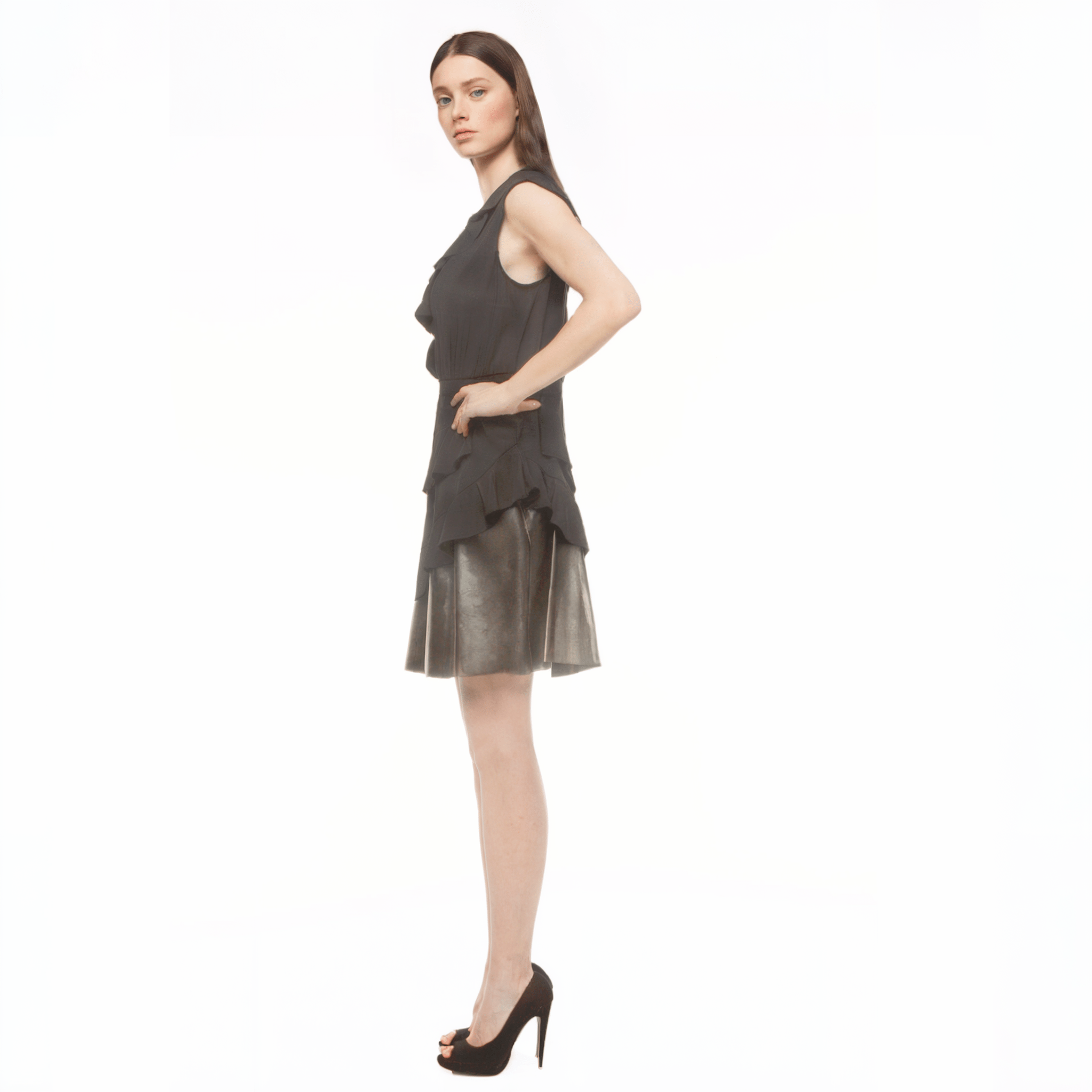 Il dettaglio distintivo รจ il fondo in ecopelle nera, che dona carattere e modernitร a un capo perfetto sia per il giorno che per la sera.