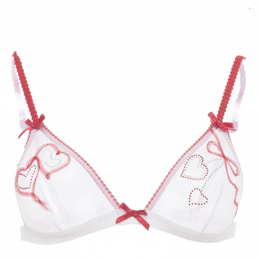 Reggiseno soft donna VERDISSIMA bianco con dettagli a cuori rossi, paillettes decorative e chiusura posteriore con gancetto.