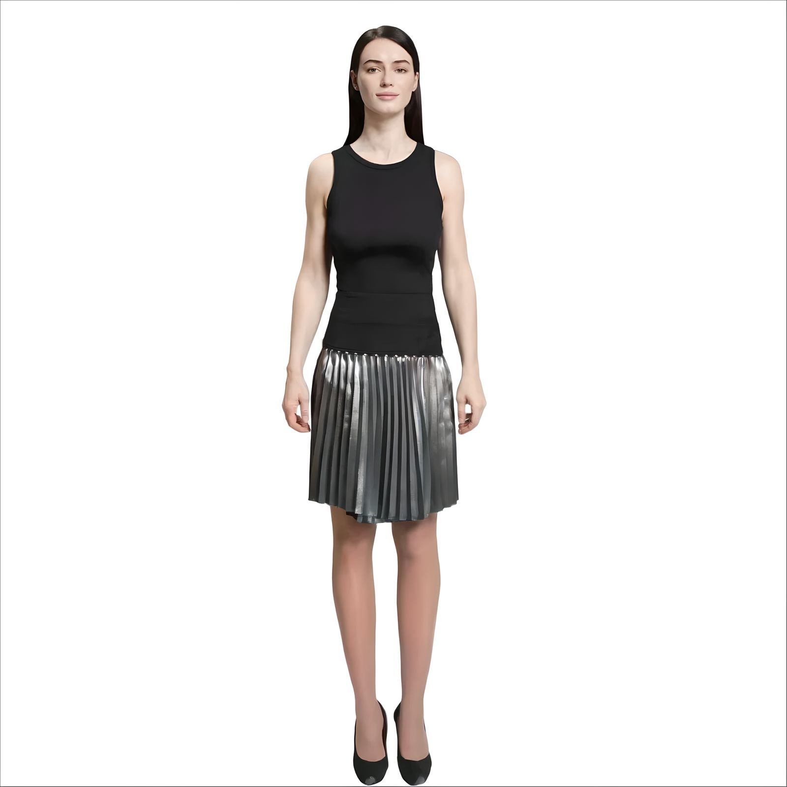 Dettagli: scollo rotondo, senza maniche, inserti metallici, gonna plissettata