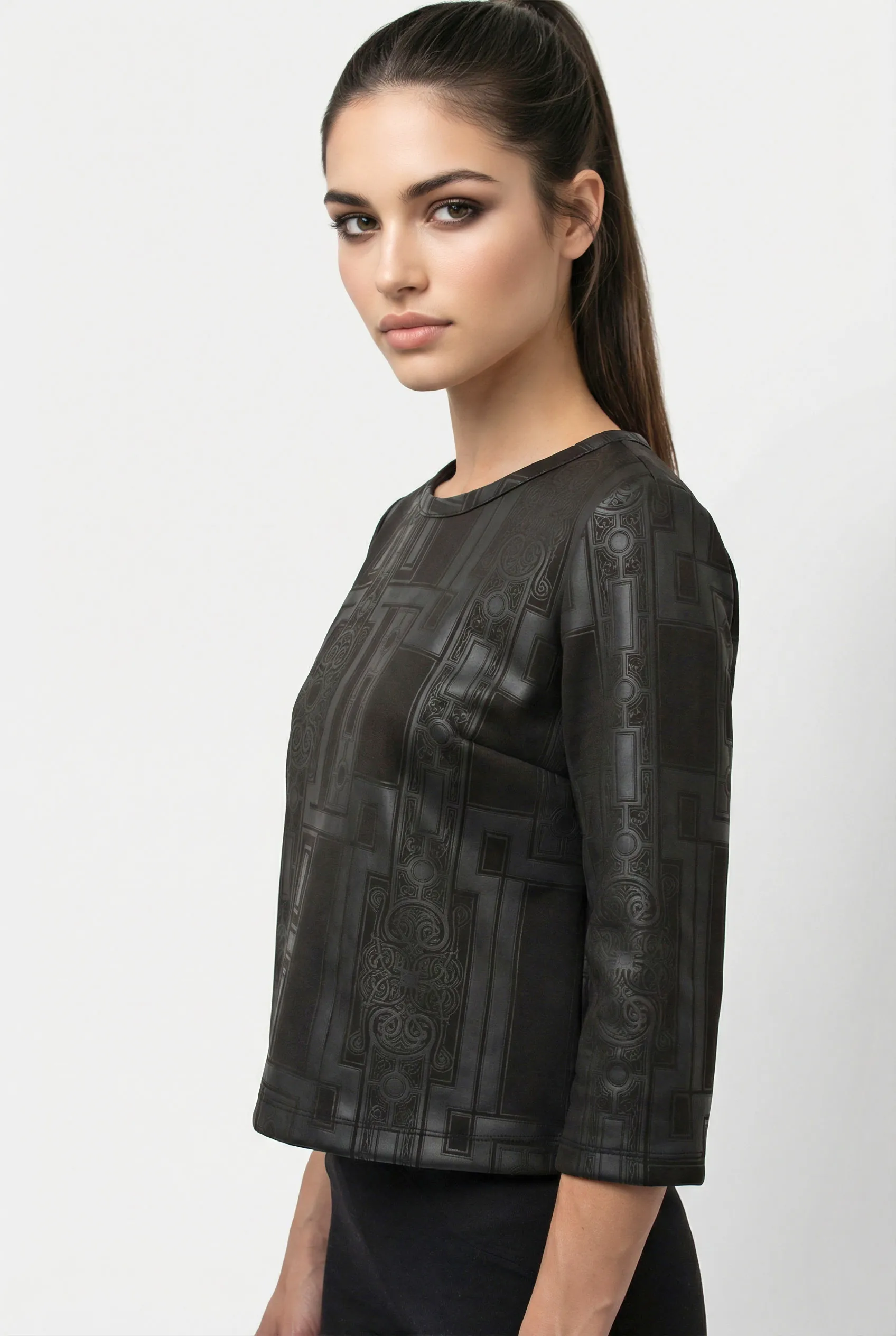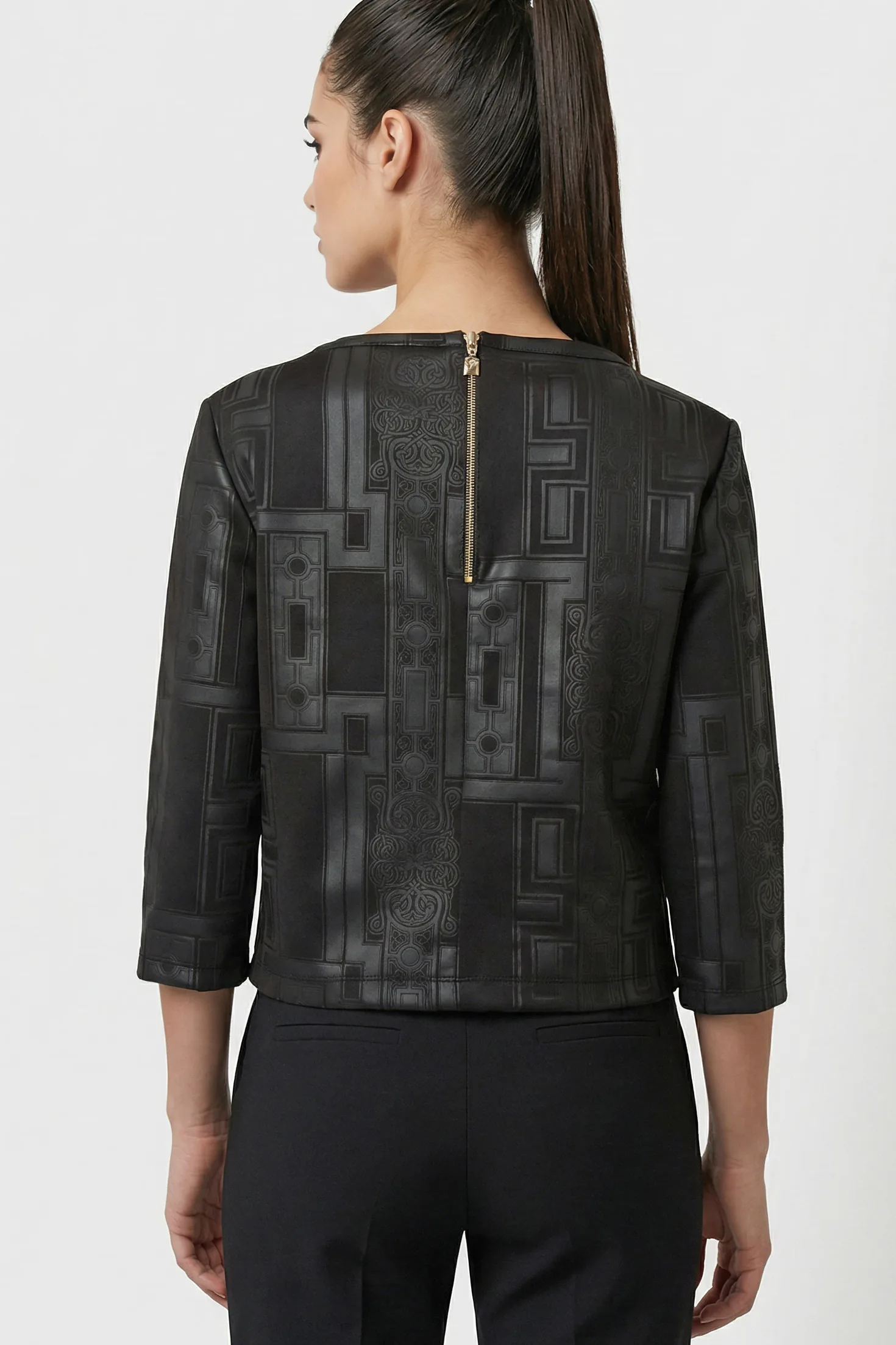 Dettagli Tecnici e Autenticità Questa maglia non è solo un capo di tendenza, ma un esempio di ingegneria tessile. La composizione tecnica (92% Poliestere, 8% Elastan) assicura che la blusa mantenga la sua forma nel tempo pur adattandosi alle linee del corpo. La zip posteriore dorata aggiunge un dettaglio prezioso, mentre le maniche a tre quarti la rendono ideale per le mezze stagioni o come elegante sottogiacca.