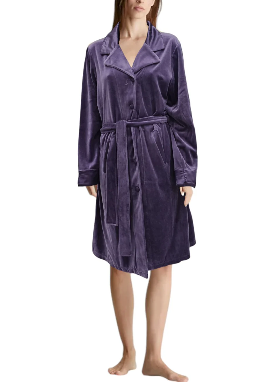 Vestaglia in morbida ciniglia con bottoni, tasche e cintura. Tinta unita con finiture in raso.