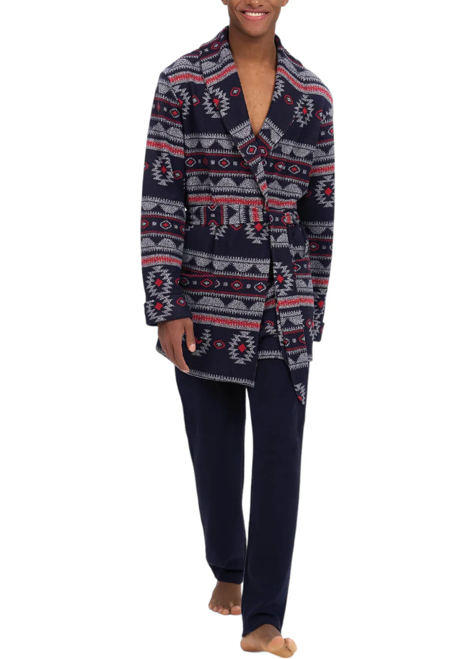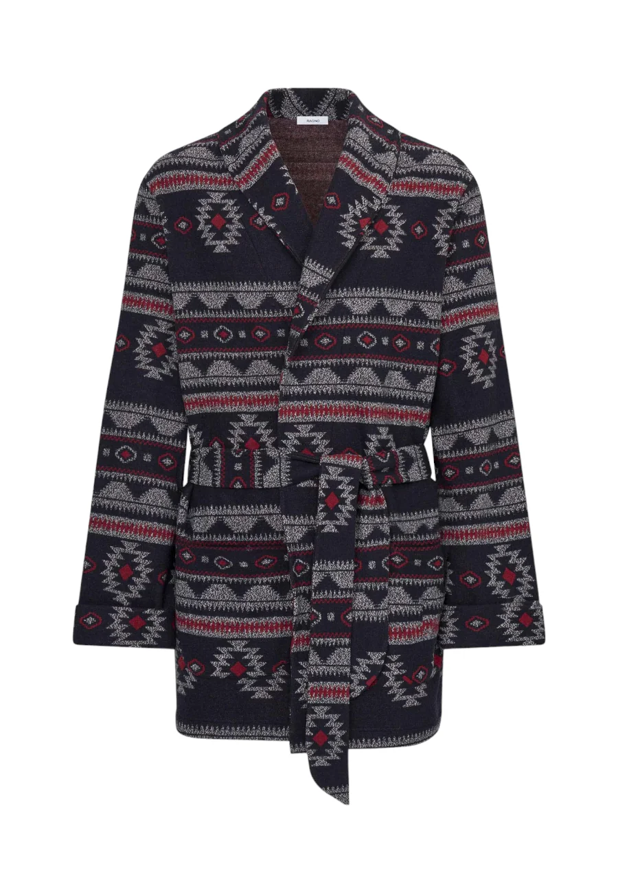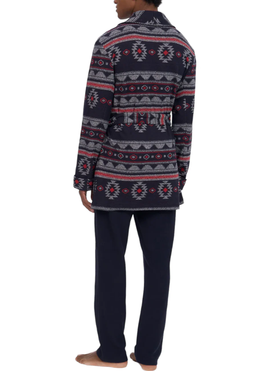 La vestaglia da camera invernale da uomo, realizzata in punto Milano, รจ un indumento che ti terrร al caldo e coccolato durante le fredde giornate e serate. Il tessuto morbido offre un comfort avvolgente, mentre la vestaglia รจ aperta con una cintura in vita per una facile chiusura. La fantasia azteca, con tonalitร di blu, bianco e rosso, aggiunge un tocco di stile distintivo e vivace.