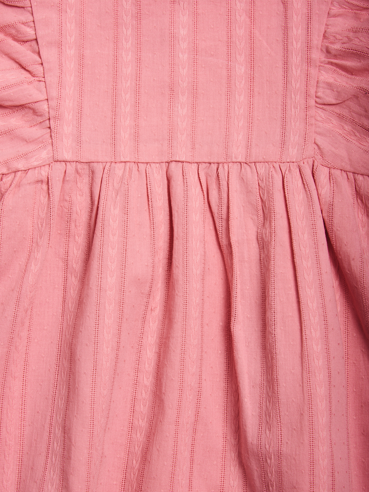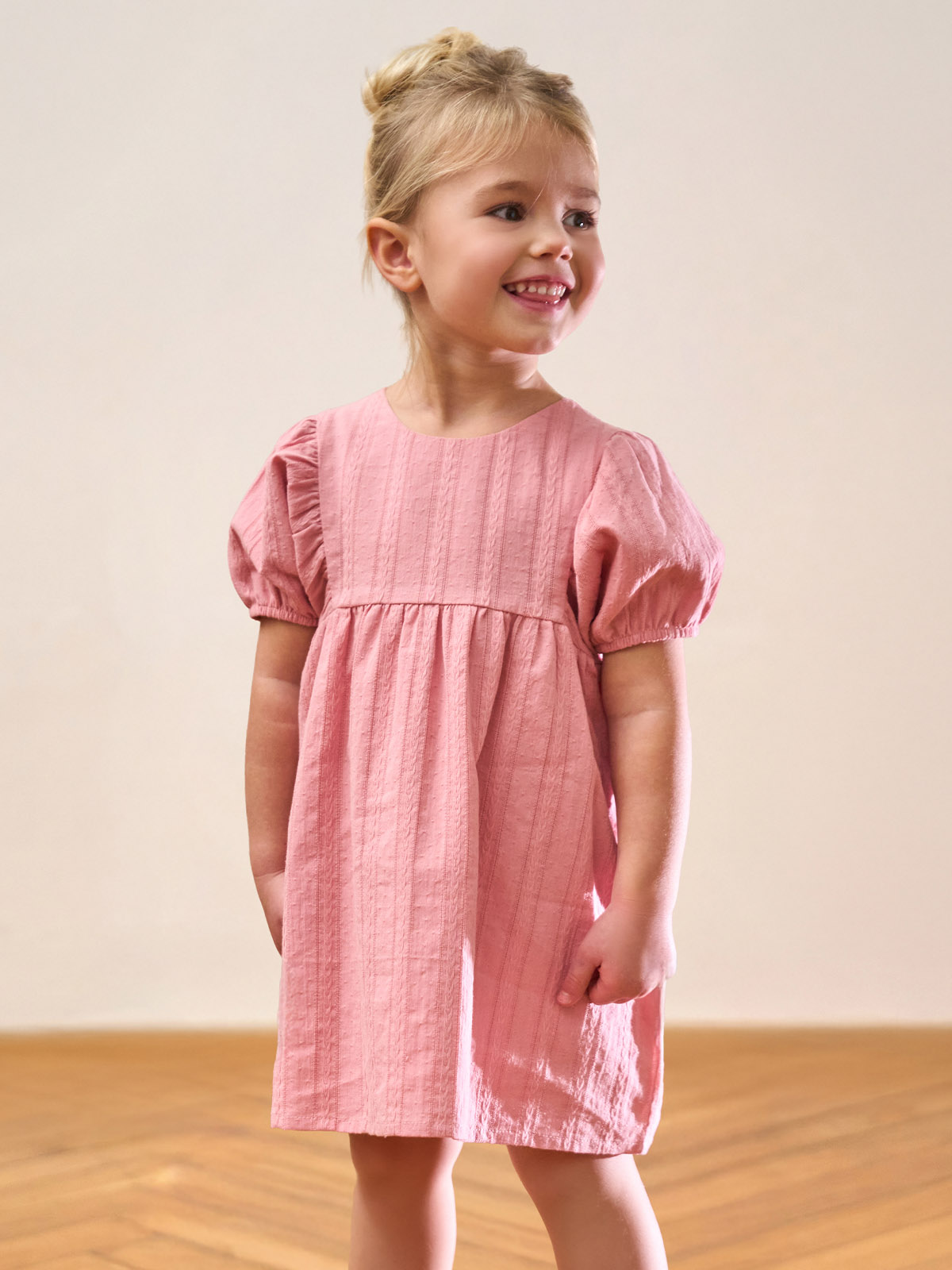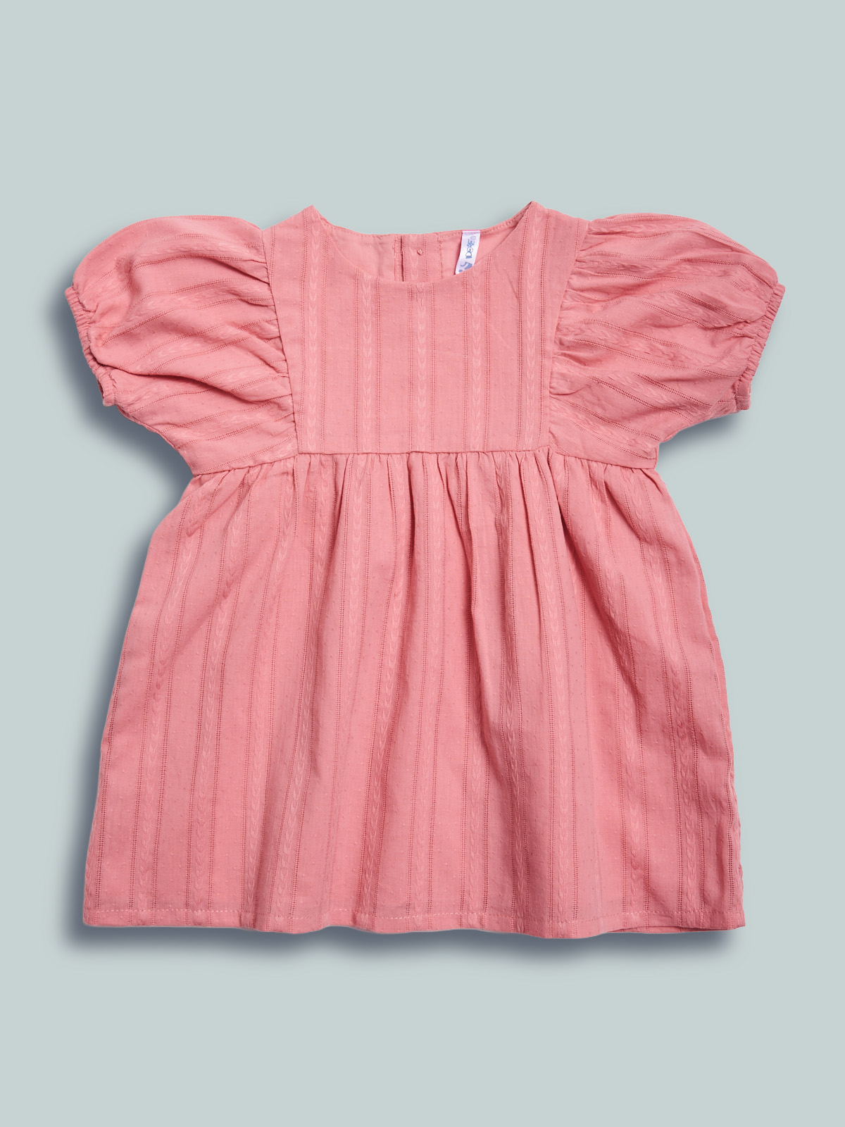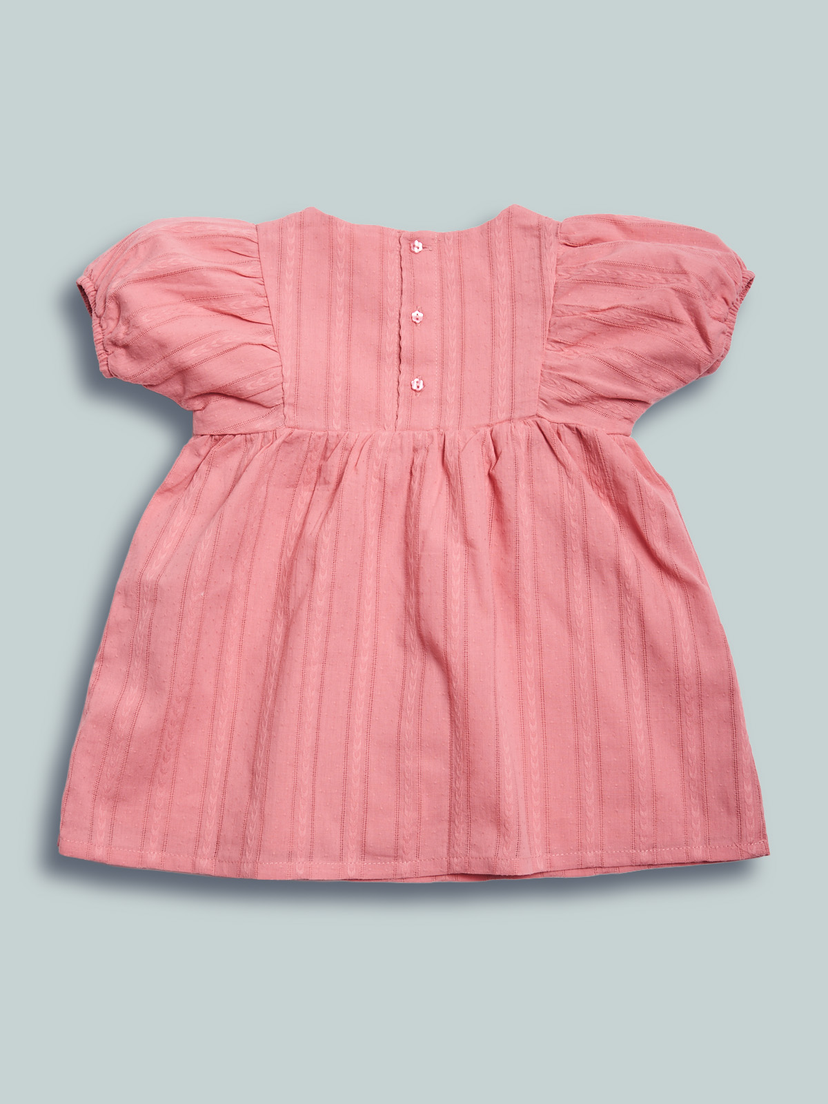 Vestito in morbido popelin operato manica corta. Foderato internamente in morbida mussola di cotone. Pratica apertura sul dietro grazie ai bottoncini. Vita con arriccio per maggiore ampiezza. Un capo fresco ideale per affrontare la primavera con stile.