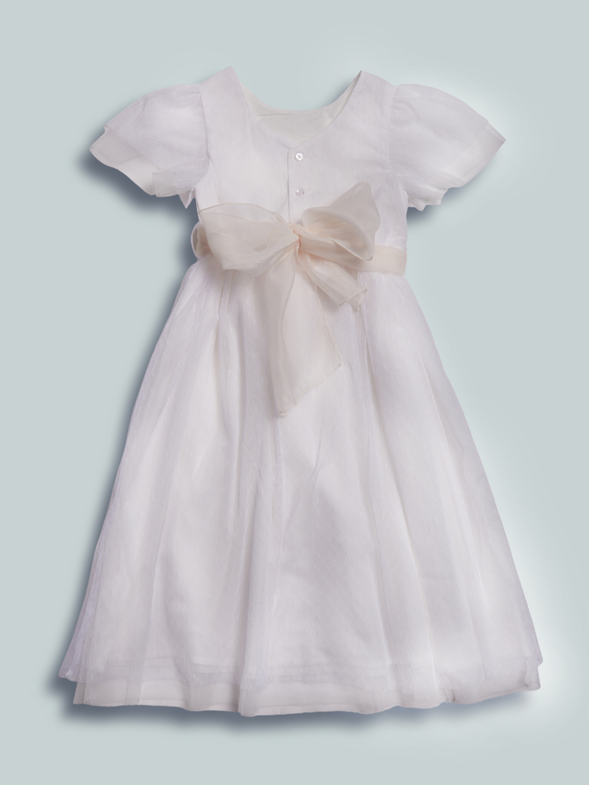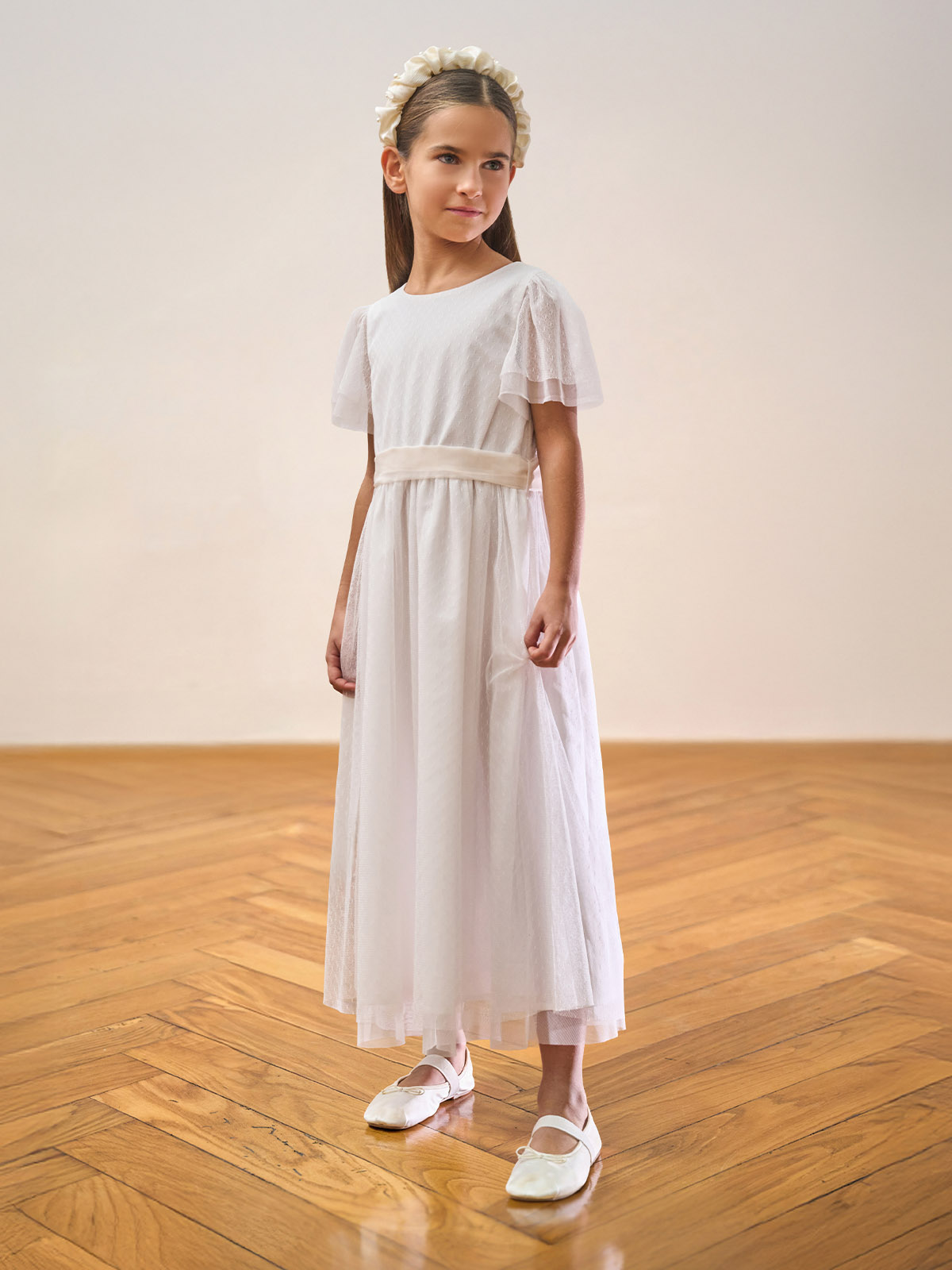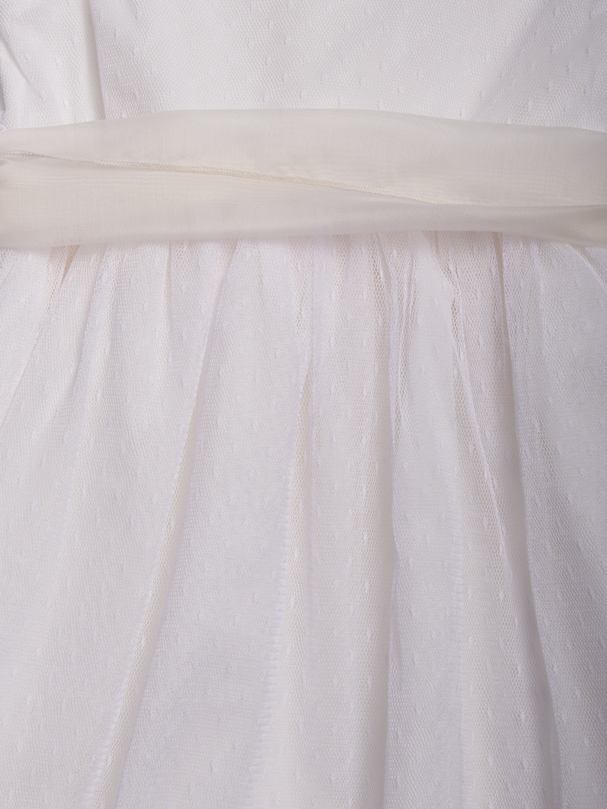 Vestito manica corta in tulle plumetis, lunghezza caviglia e vestibilitร morbida. Fusciacca in vita in contrasto di colore annodata dietro con fiocco. Apertura posteriore con bottoni effetto madreperla. Un capo dai dettagli sofisticati ideale per la cerimonia.