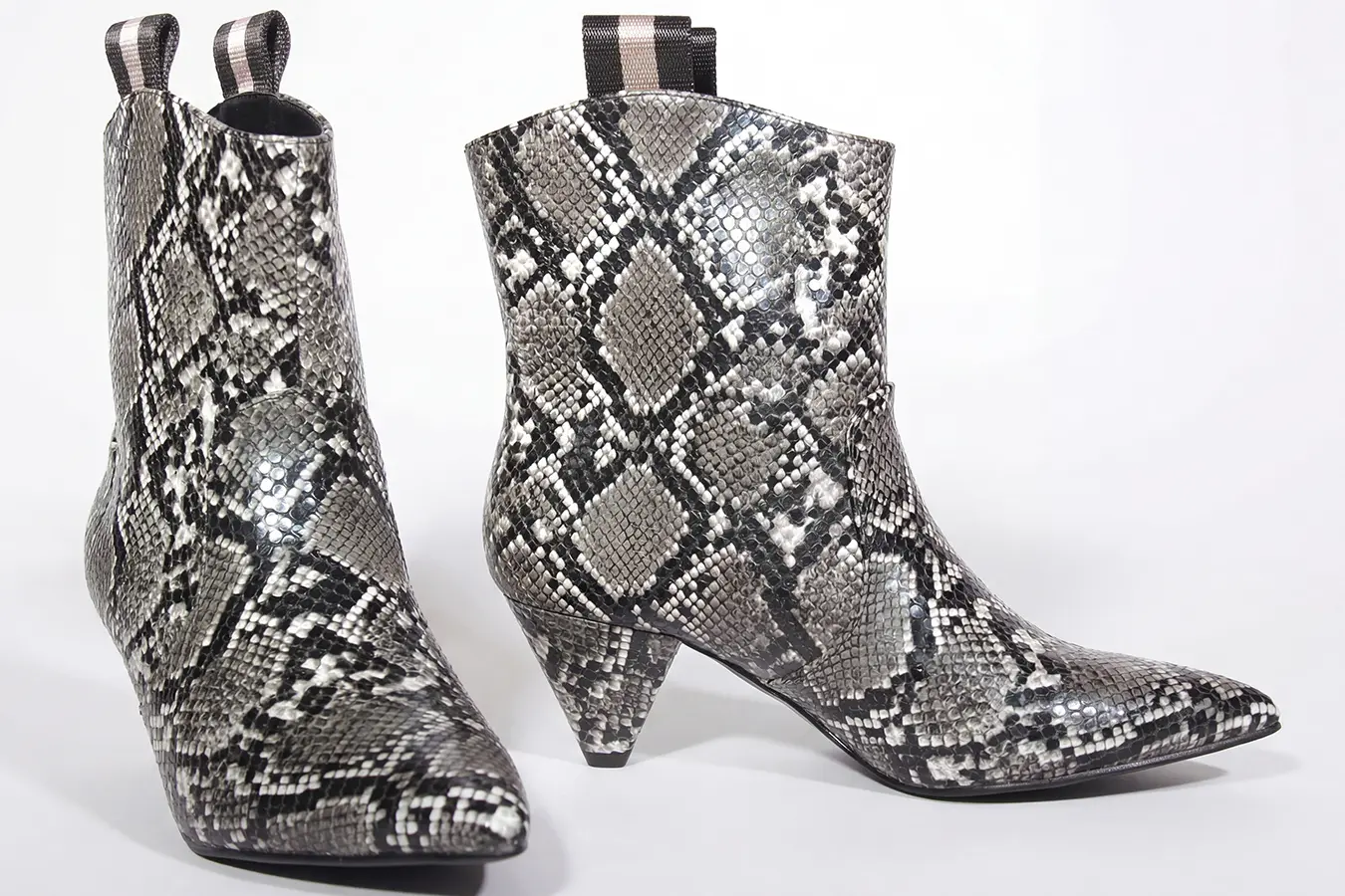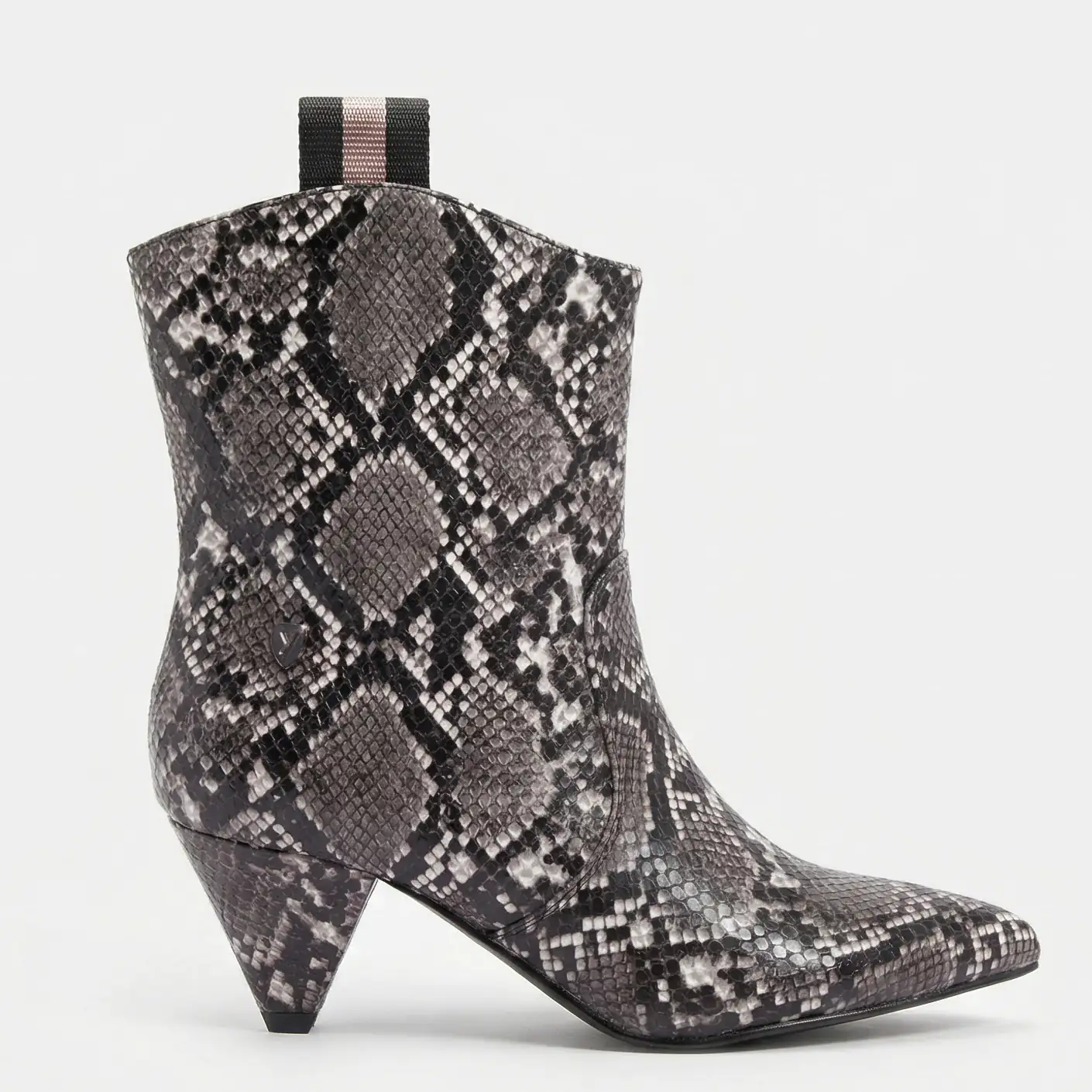 Sfida le convenzioni con una determinazione magnetica. Lo stivaletto Tamara non è solo una calzatura, ma una dichiarazione di stile audace: la sua trama pitonata grigio-fumo cattura lo sguardo, mentre il tacco a cono regala slancio e sicurezza ad ogni passo. Perfetto per la donna che ama distinguersi, trasforma anche il look più minimale in un outfit pieno di carattere.